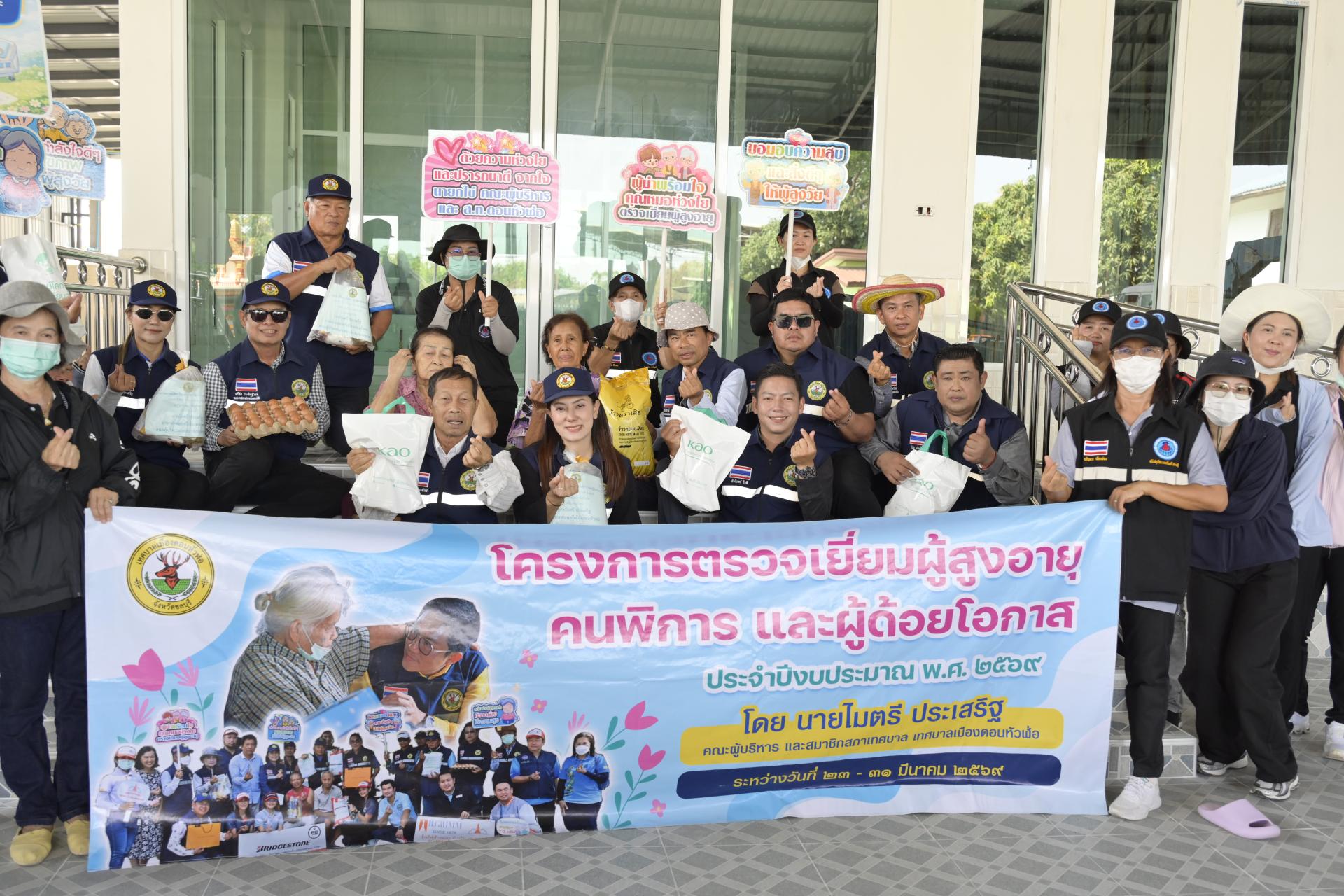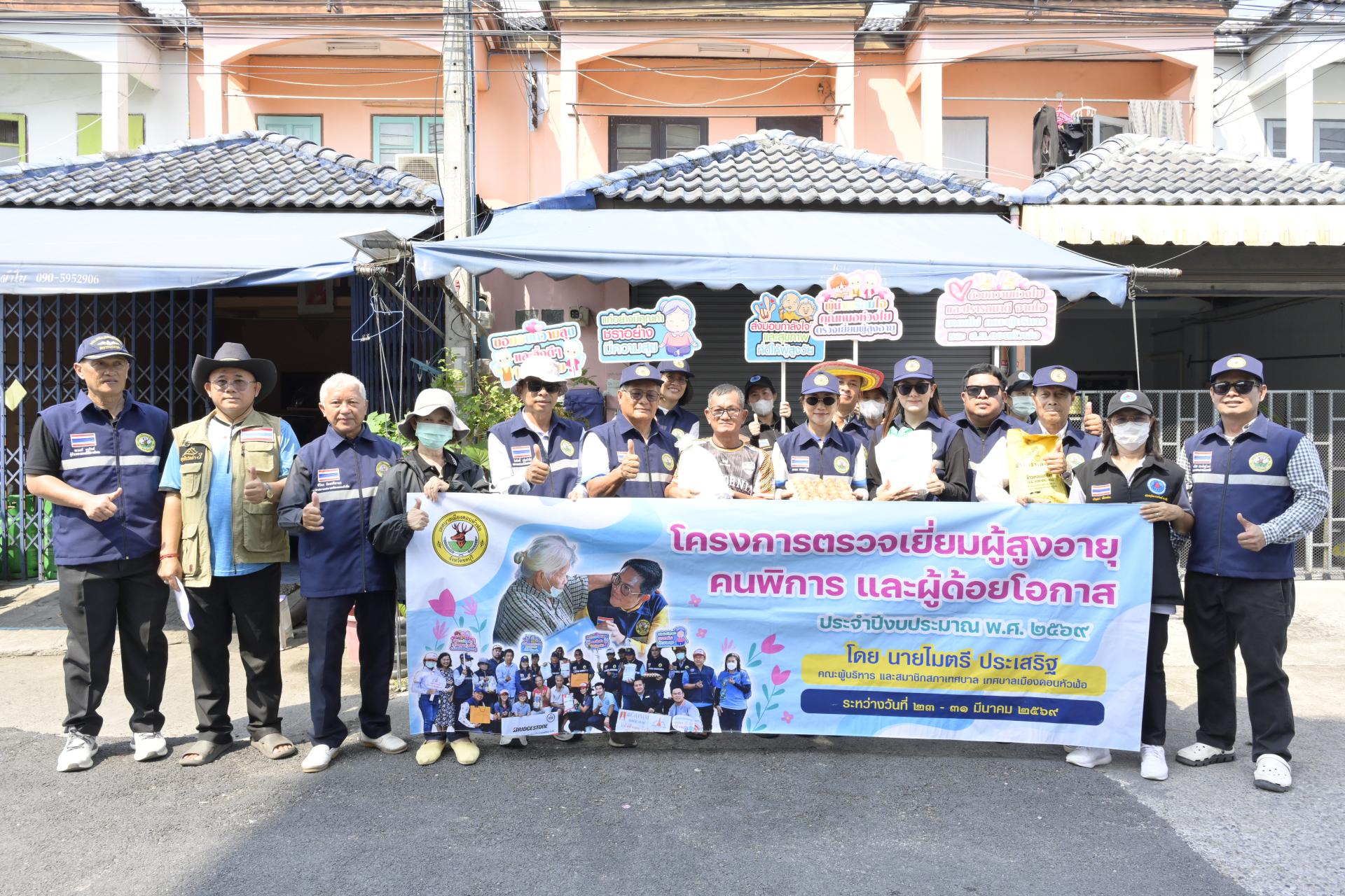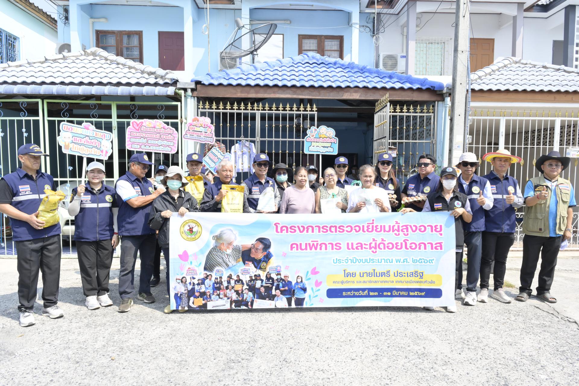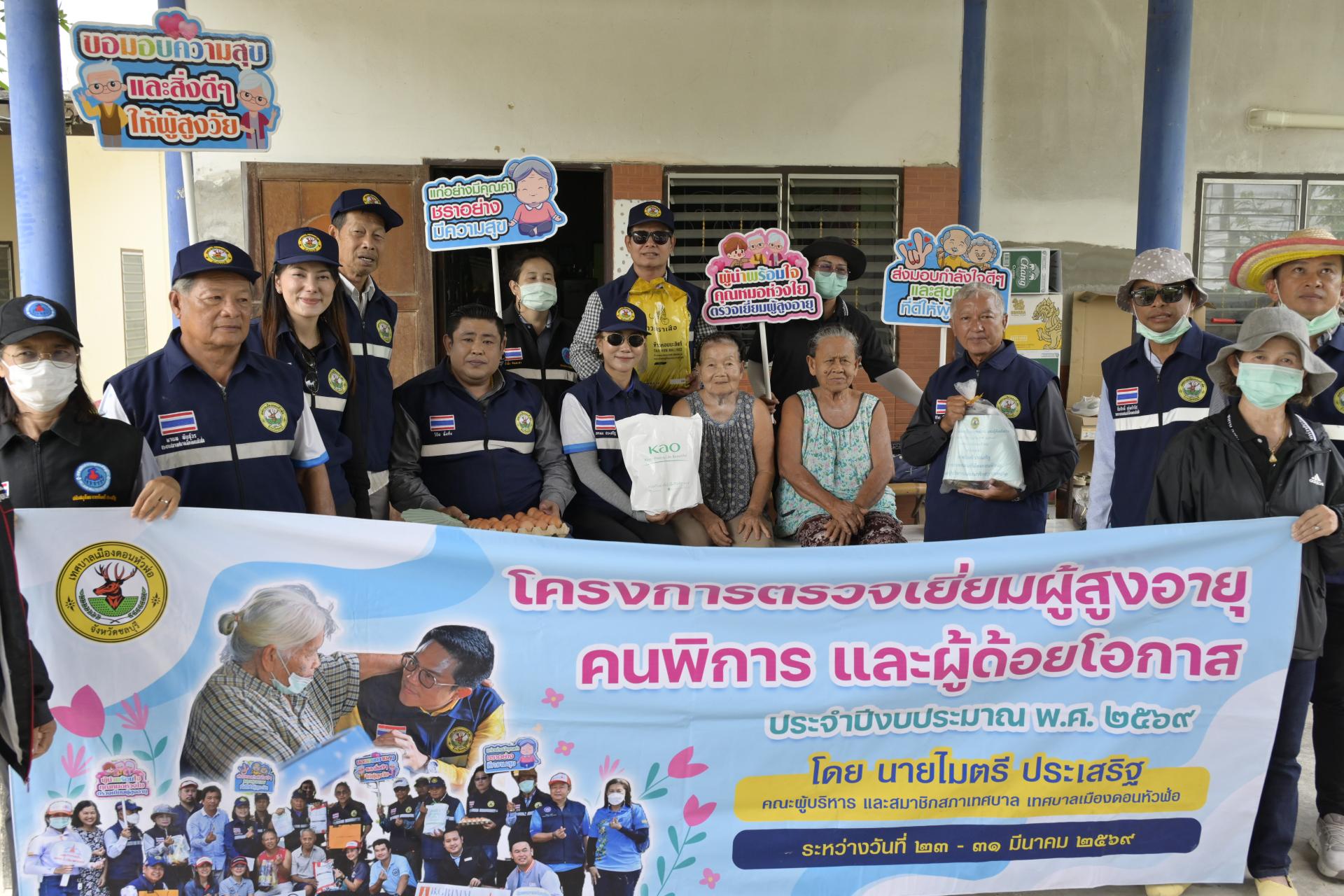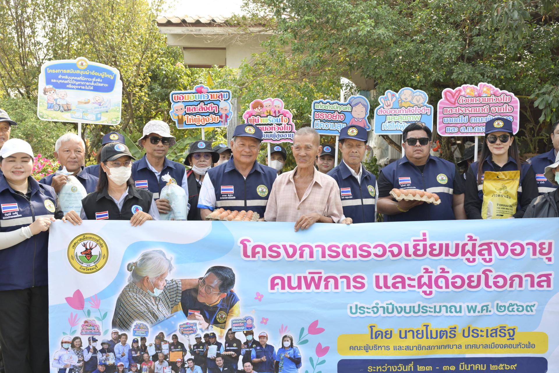 นายธีรศักดิ์ แจ่มจำรัส รองนายกเทศมนตรีเมืองดอนหัวฬ่อ นางสาวสุพิชฌาย์ ปานผดุง รองนายกเทศมนตรีเมืองดอนหัวฬ่อ พร้อมด้วยคณะผู้บริหาร สมาชิกสภาเทศบาล หัวหน้าส่วนราชการ เจ้าหน้าที่เทศบาล อสม. ตำบลดอนหัวฬ่อ ร่วมลงพื้นที่ดำเนินโครงการตรวจเยี่ยมผู้สูงอายุ คนพิการ และผู้ด้อยโอกาส ประจำปีงบประมาณ พ.ศ. 2569 ระหว่างวันที่ 23 - 31 มีนาคม 2569 โดยได้ลงพื้นที่ตรวจเยี่ยม และมอบสิ่งของอุปโภค บริโภค พร้อมตรวจสุขภาพให้แก่ผู้สูงอายุ (อายุ 70 ปีขึ้นไป) คนพิการ และผู้ด้อยโอกาส ที่อาศัยอยู่ในเขตพื้นที่หมู่ที่ 3 ตำบลดอนหัวฬ่อ อำเภอเมืองชลบุรี จังหวัดชลบุรี