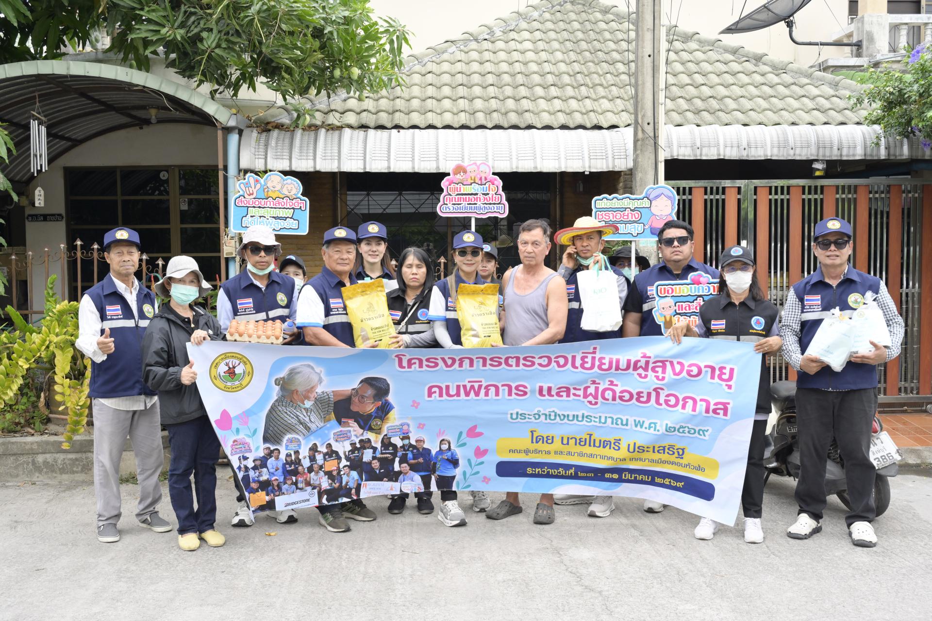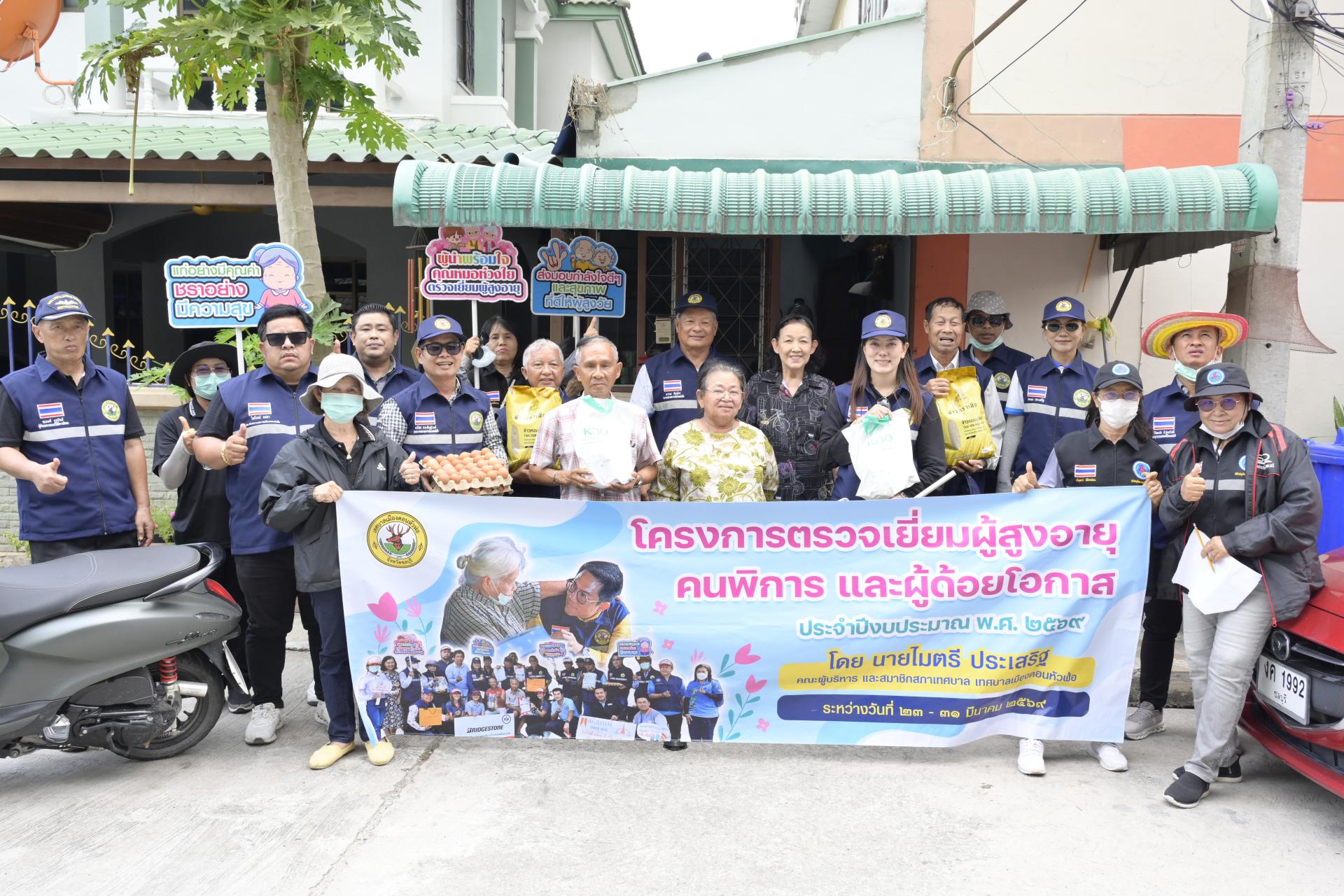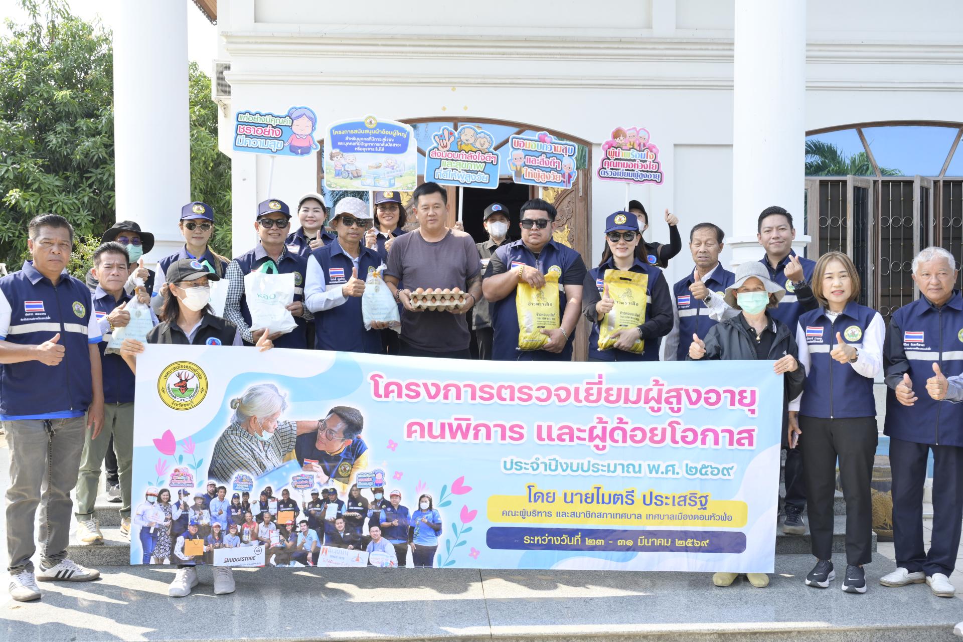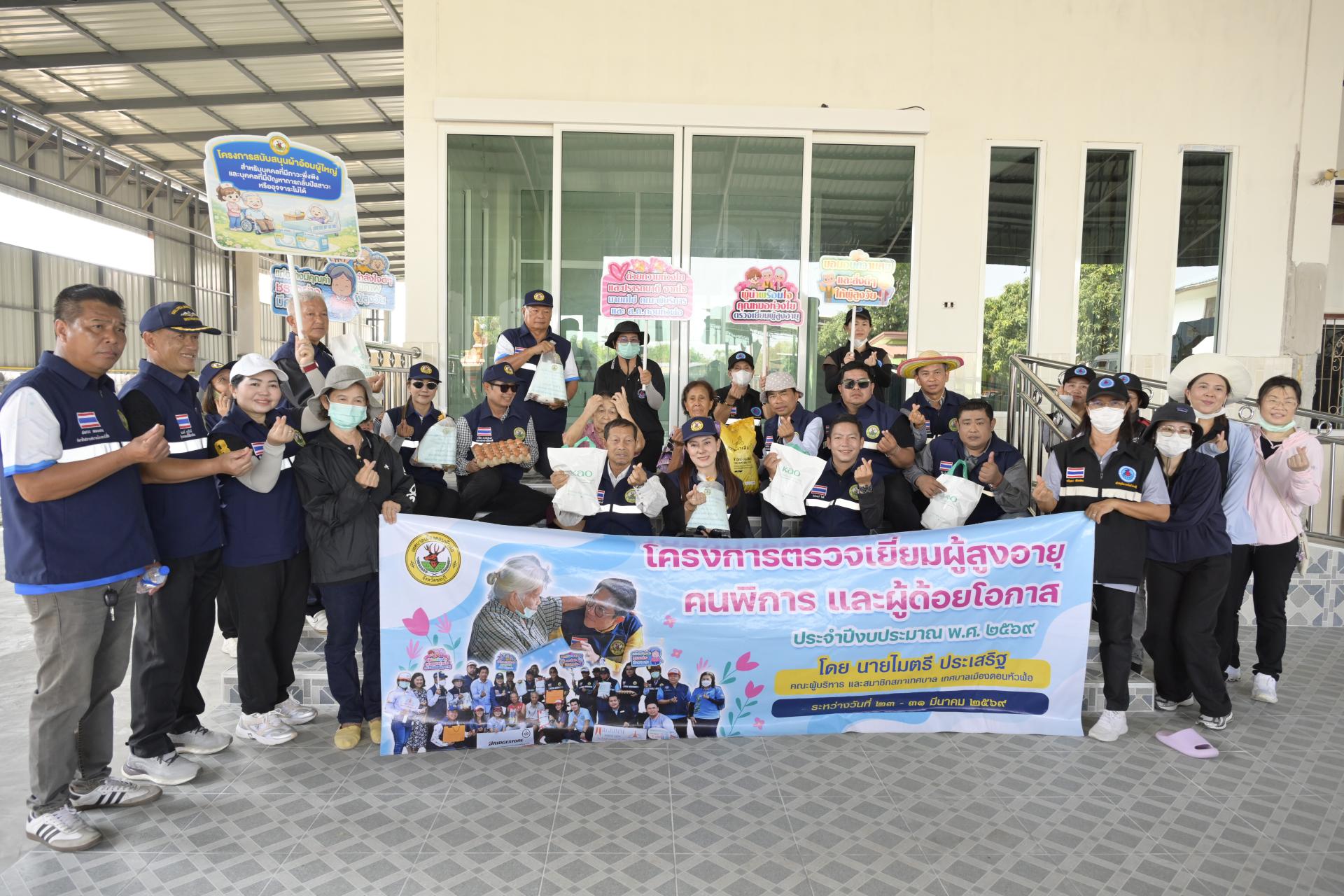 นายธีรศักดิ์ แจ่มจำรัส รองนายกเทศมนตรีเมืองดอนหัวฬ่อ นางสาวสุพิชฌาย์ ปานผดุง รองนายกเทศมนตรีเมืองดอนหัวฬ่อ พร้อมด้วยคณะผู้บริหาร สมาชิกสภาเทศบาล หัวหน้าส่วนราชการ เจ้าหน้าที่เทศบาล อสม. ตำบลดอนหัวฬ่อ ร่วมลงพื้นที่ดำเนินโครงการตรวจเยี่ยมผู้สูงอายุ คนพิการ และผู้ด้อยโอกาส ประจำปีงบประมาณ พ.ศ. 2569 ระหว่างวันที่ 23 - 31 มีนาคม 2569 โดยได้ลงพื้นที่ตรวจเยี่ยม และมอบสิ่งของอุปโภค บริโภค พร้อมตรวจสุขภาพให้แก่ผู้สูงอายุ (อายุ 70 ปีขึ้นไป) คนพิการ และผู้ด้อยโอกาส ที่อาศัยอยู่ในเขตพื้นที่หมู่ที่ 3 ตำบลดอนหัวฬ่อ อำเภอเมืองชลบุรี จังหวัดชลบุรี