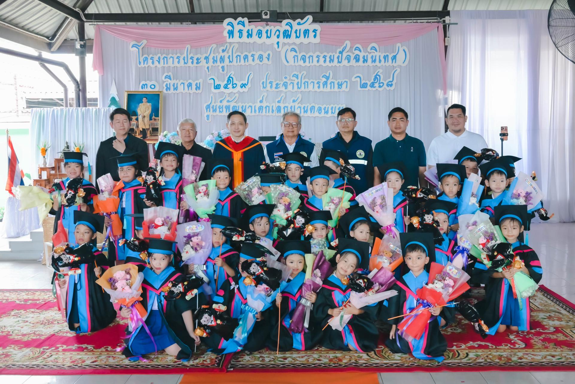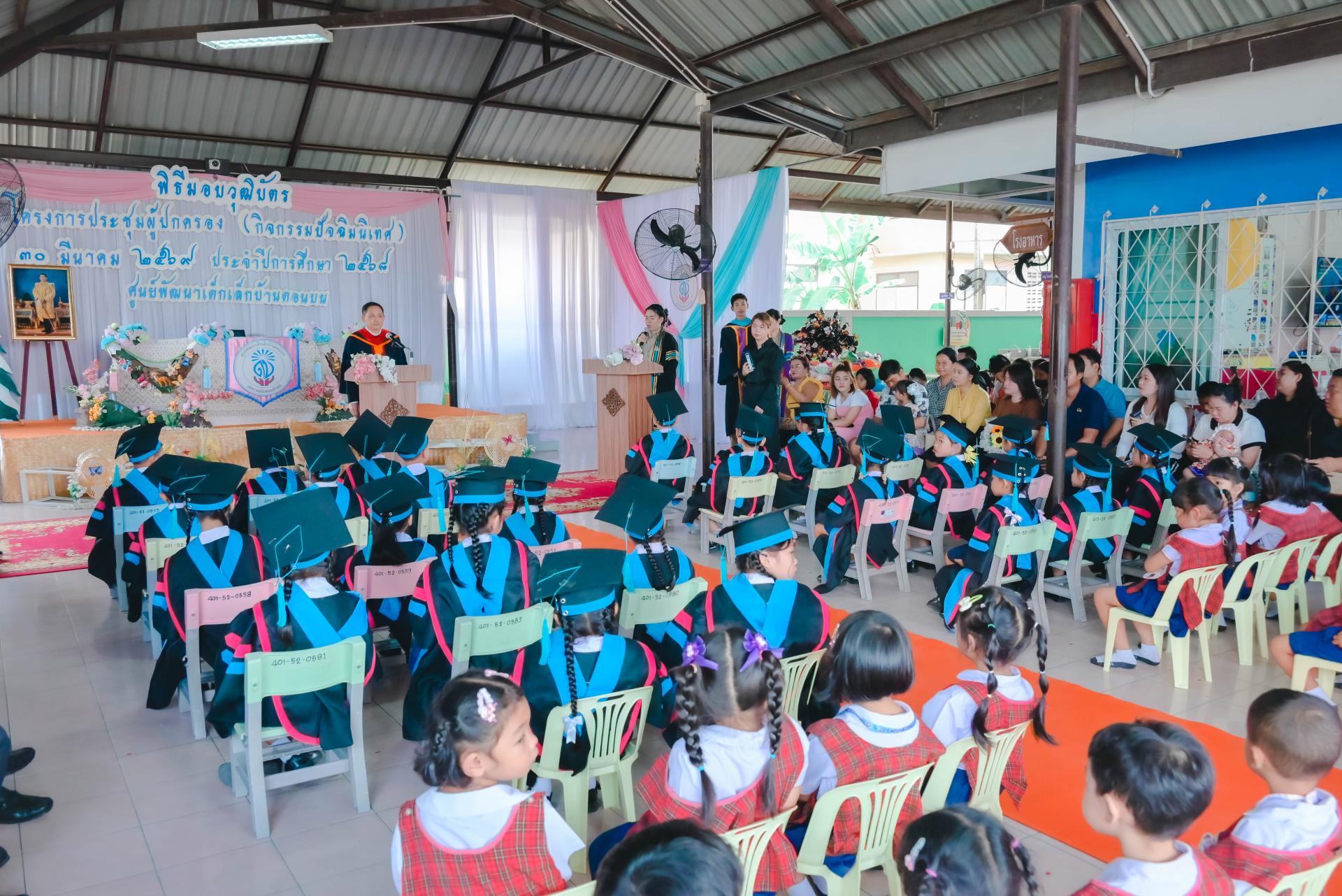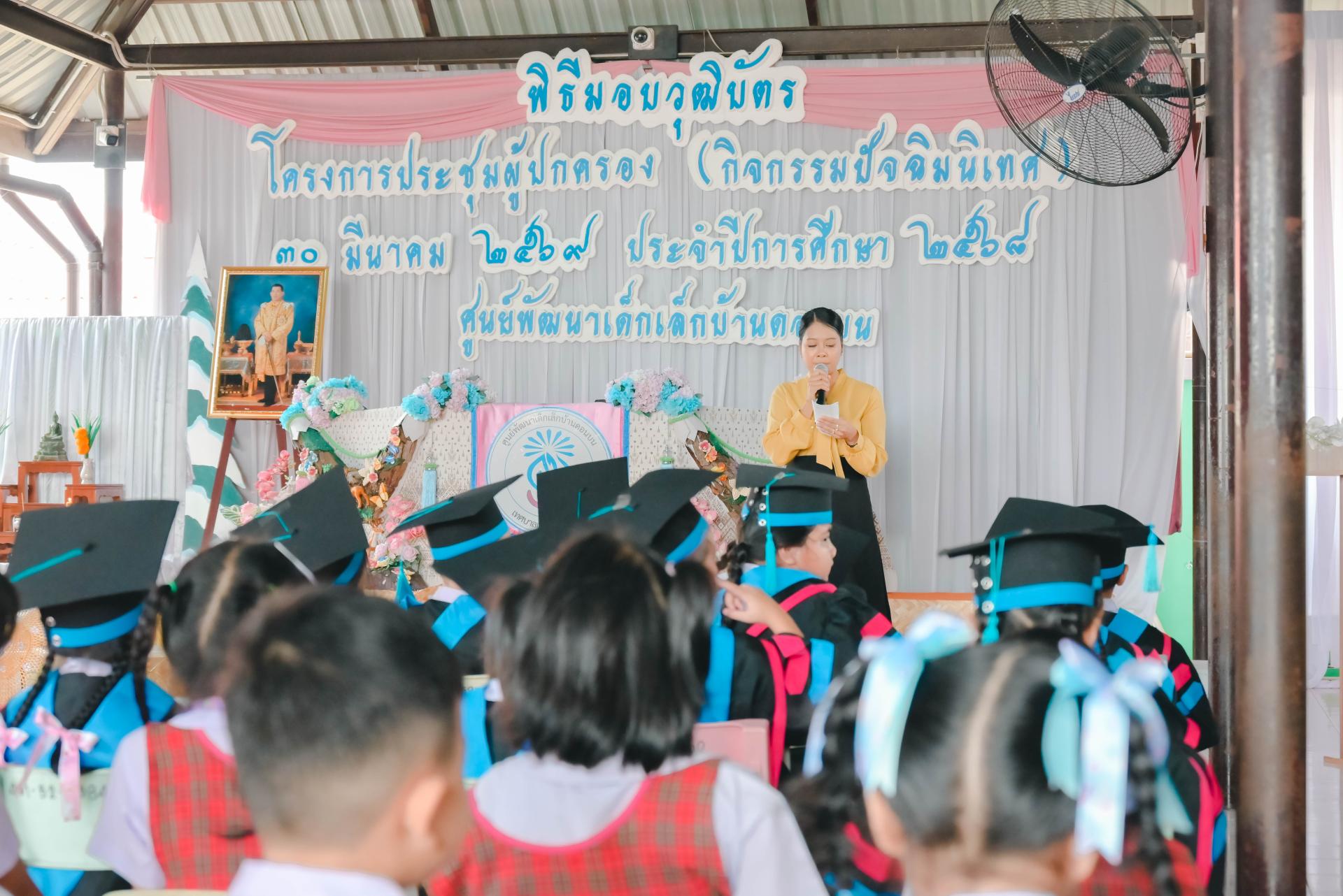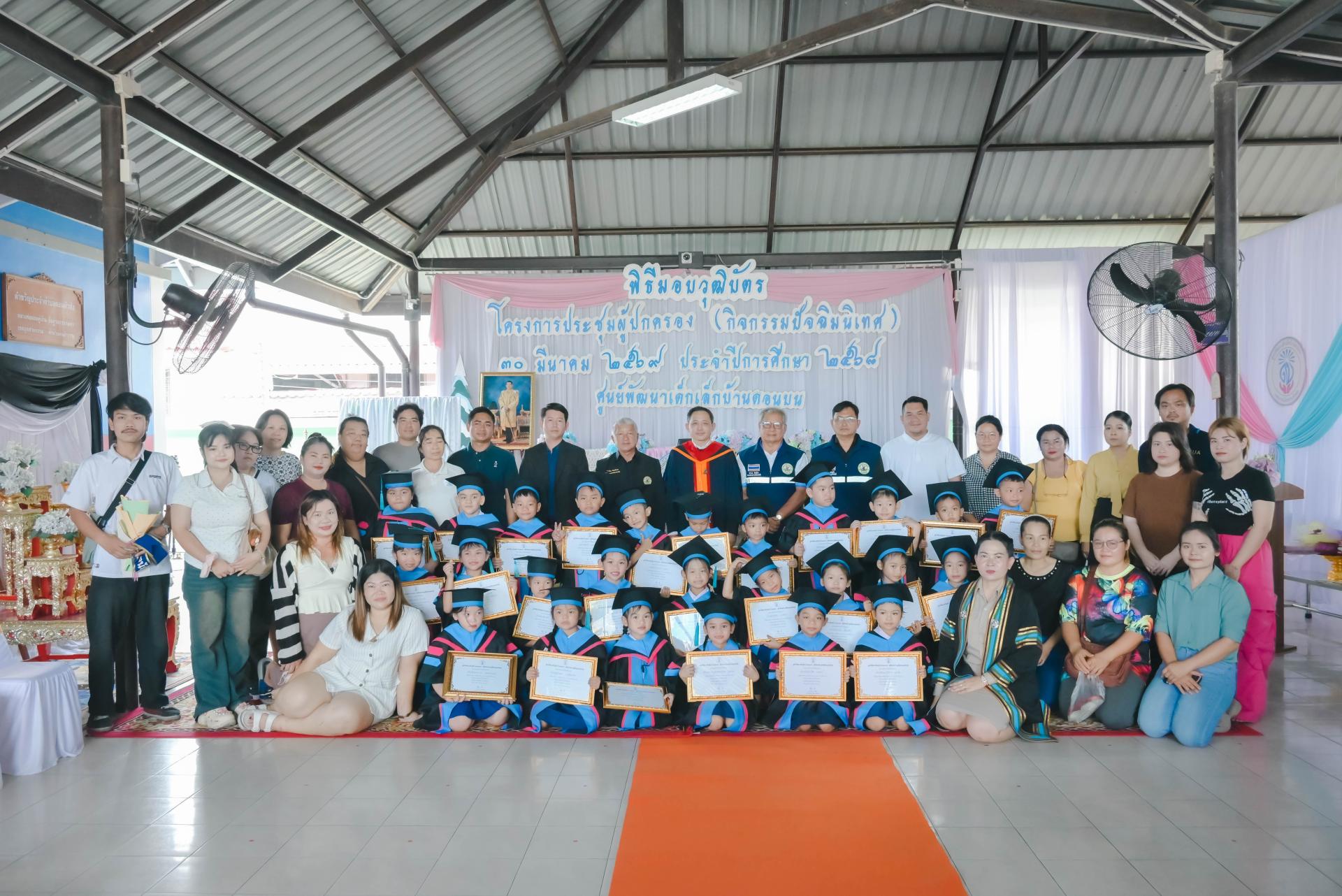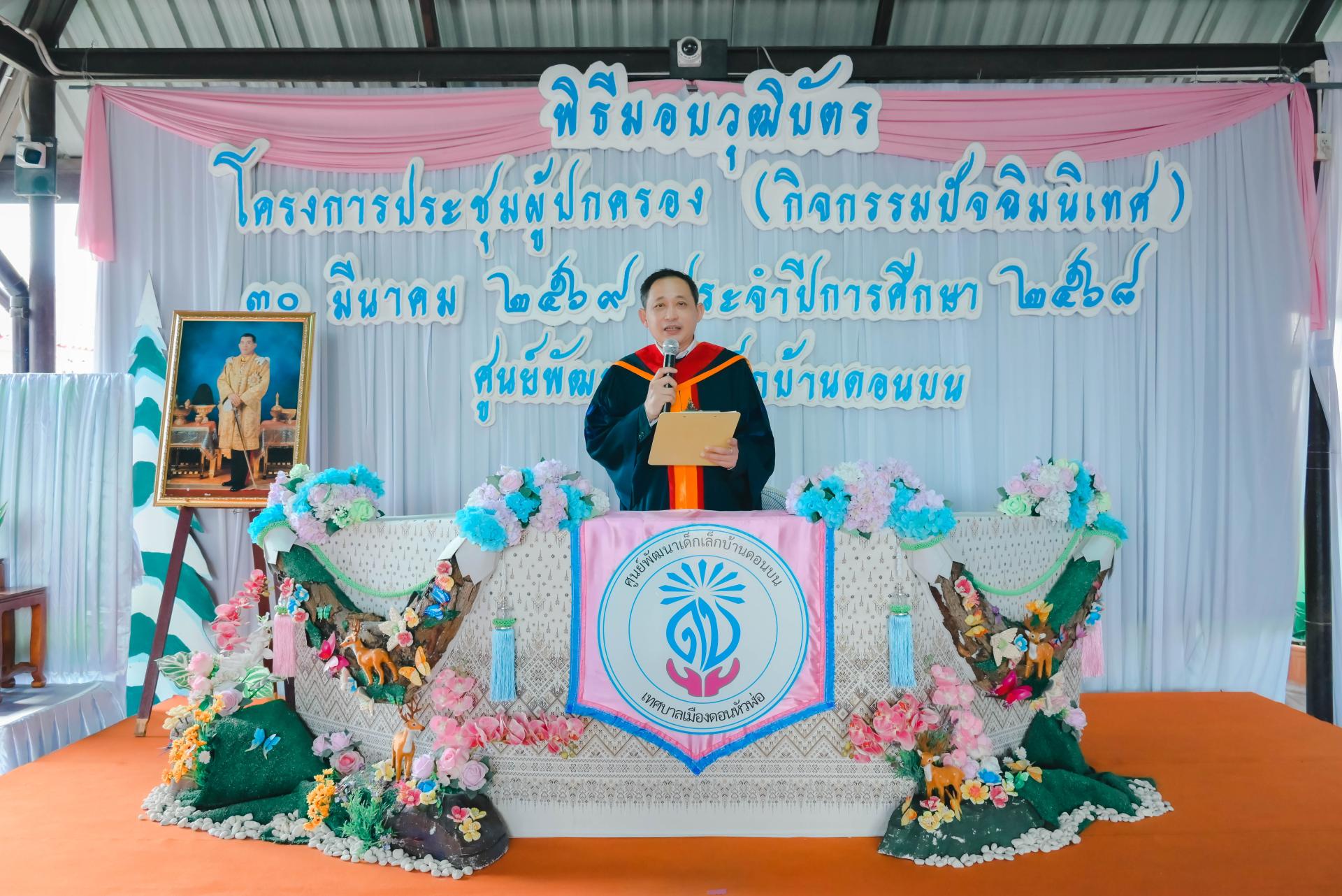 ศูนย์พัฒนาเด็กเล็กบ้านดอนบน จัดพิธีมอบวุฒิบัตรโครงการประชุมผู้ปกครอง (กิจกรรมปัจฉิมนิเทศ) โดยได้รับเกียรติจากนายปภังกร เจริญสมบัติ ผู้อำนวยการกองการศึกษา เป็นประธานในพิธีเปิด นางสาวเสาวลักษณ์ บุญเพียร ครู รักษาการในตำแหน่งผู้อำนวยการศูนย์พัฒนาเด็กเล็กบ้านดอนบน กล่าวรายงานวัตถุประสงค์ของโครงการ พร้อมด้วยสมาชิกสภาเทศบาล ผู้ปกครอง คณะครู และนักเรียน เข้าร่วมกิจกรรม ณ ศูนย์พัฒนาเด็กเล็กบ้านดอนบน