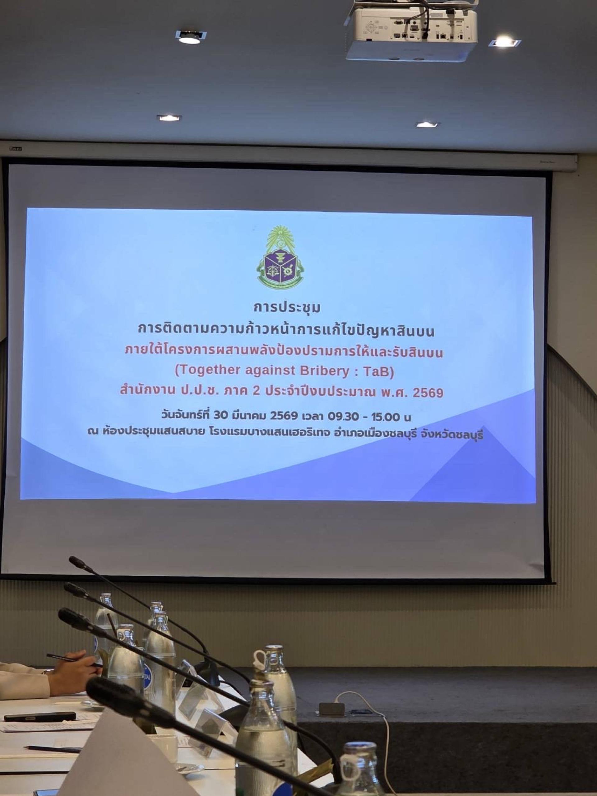 นายไมตรี ประเสริฐ นายกเทศมนตรีเมืองดอนหัวฬ่อ เข้าร่วมการประชุมการติดตามความก้าวหน้าการแก้ไขปัญหาสินบน ภายใต้โครงการผสานพลังป้องปรามการให้และรับสินบน (Together against Bribery : TaB) ของสำนักงาน ป.ป.ช. ภาค 2 ประจำปีงบประมาณ พ.ศ. 2569 โดยมีพลตำรวจตรี อรุณ อมรวิริยะกุล รองเลขาธิการคณะกรรมการ ป.ป.ช. ภาค 2 เป็นประธานในการประชุม ณ ห้องประชุมแสนสบาย โรงแรมบางแสนเฮอริเทจ อำเภอเมืองชลบุรี จังหวัดชลบุรี