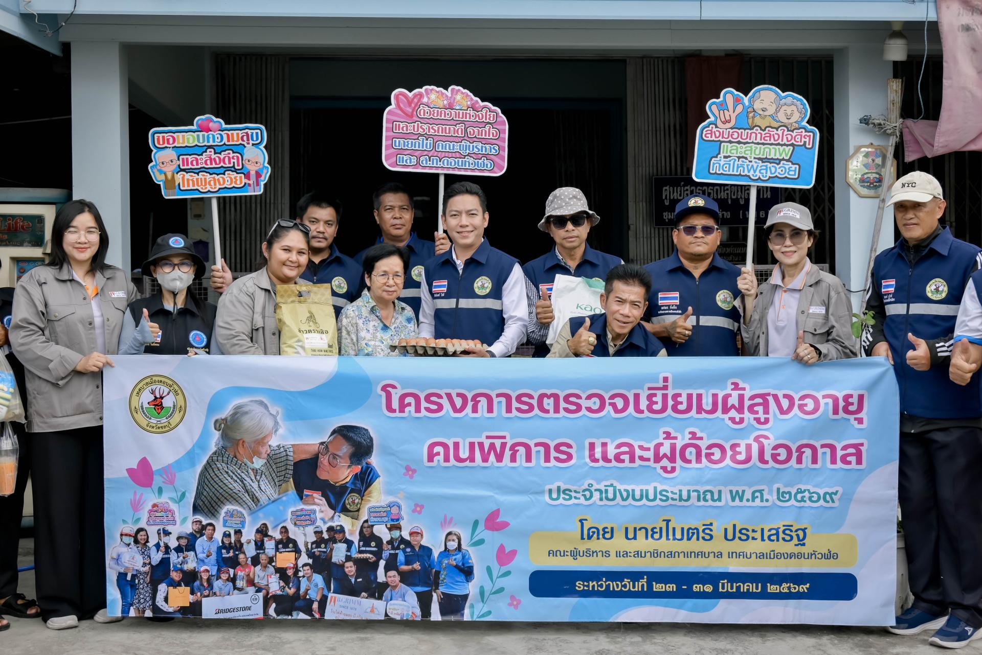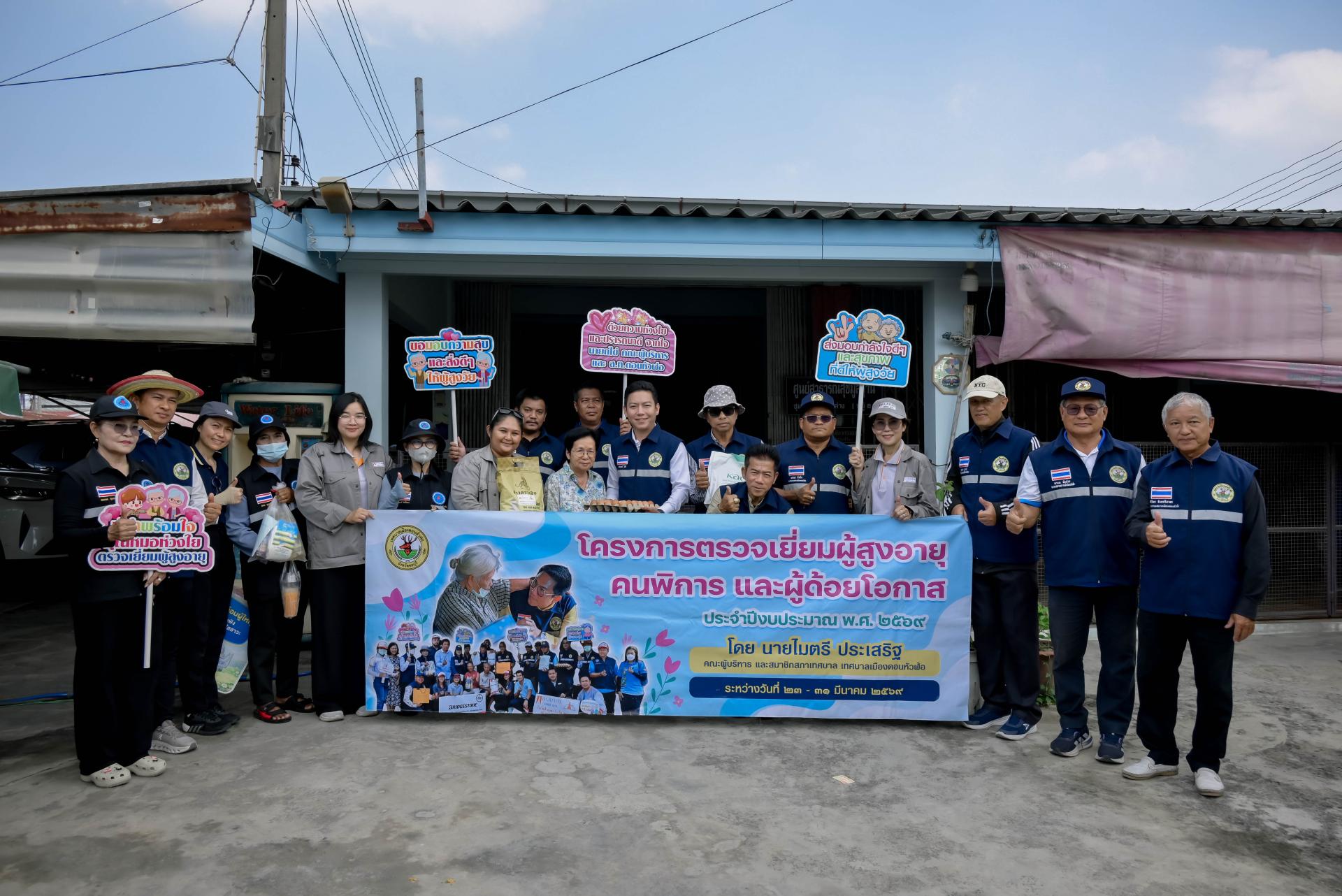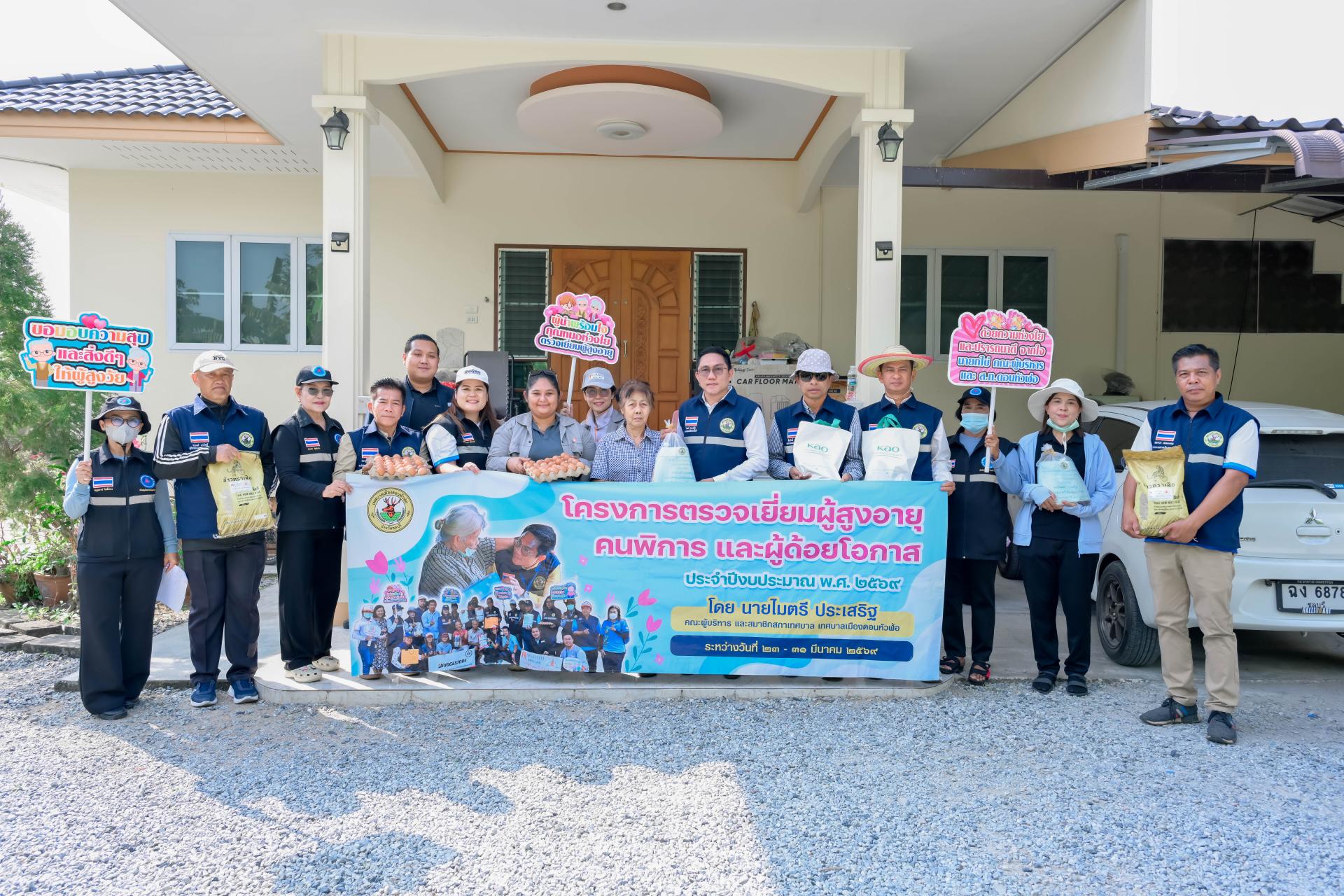 นายไมตรี ประเสริฐ นายกเทศมนตรีเมืองดอนหัวฬ่อ พร้อมด้วยนายธีรศักดิ์ แจ่มจำรัส รองนายกเทศมนตรีเมืองดอนหัวฬ่อ คณะผู้บริหาร สมาชิกสภาเทศบาล หัวหน้าส่วนราชการ เจ้าหน้าที่เทศบาล และอสม. ตำบลดอนหัวฬ่อ ร่วมลงพื้นที่ดำเนินโครงการตรวจเยี่ยมผู้สูงอายุ คนพิการ และผู้ด้อยโอกาส ประจำปีงบประมาณ พ.ศ. 2569 ระหว่างวันที่ 23 - 31 มีนาคม 2569 โดยได้ลงพื้นที่ตรวจเยี่ยม พร้อมมอบสิ่งของอุปโภค บริโภค และตรวจสุขภาพให้แก่ผู้สูงอายุ (อายุ 70 ปีขึ้นไป) คนพิการ และผู้ด้อยโอกาส ที่อาศัยอยู่ในเขตพื้นที่หมู่ที่ 6 ตำบลดอนหัวฬ่อ อำเภอเมืองชลบุรี จังหวัดชลบุรี