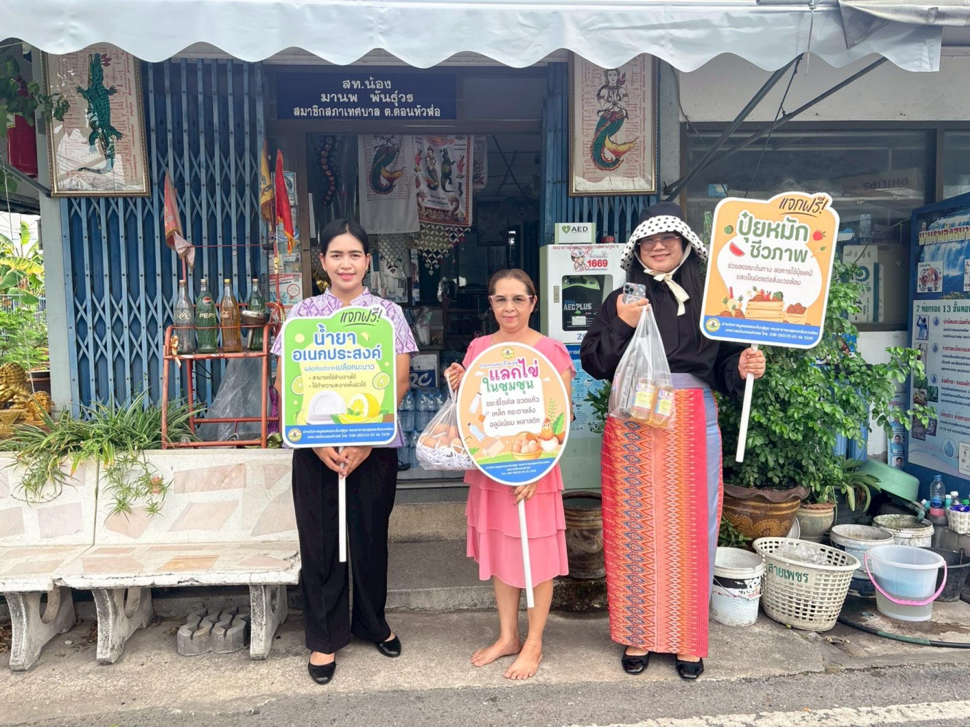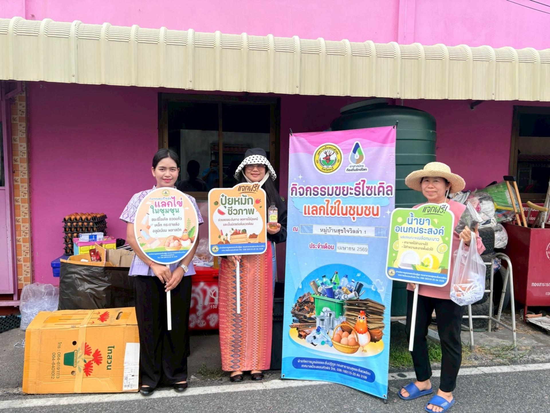 กองสาธารณสุขและสิ่งแวดล้อม ฝ่ายจัดการมูลฝอยและสิ่งปฏิกูล ดำเนินกิจกรรมขยะรีไซเคิลแลกไข่ในชุมชน ณ หมู่บ้านสุขใจวิลล่า 1 จำนวนน้ำหนักขยะรวม 374.60 กิโลกรัม เพื่อเสริมสร้างจิตสำนึกที่ดีในการแยกขยะก่อนทิ้งให้แก่ประชาชนในเขตเทศบาลเมืองดอนหัวฬ่อ รวมถึงวิธีการลดปริมาณขยะ การคัดแยก การนำกลับมาใช้ใหม่ ภายใต้หลักการ ๓Rs อันจะนำไปสู่การลดขยะจากต้นทาง และร่วมกันรักษาสภาพแวดล้อม ให้ดีขึ้นอย่างยั่งยืนต่อไป