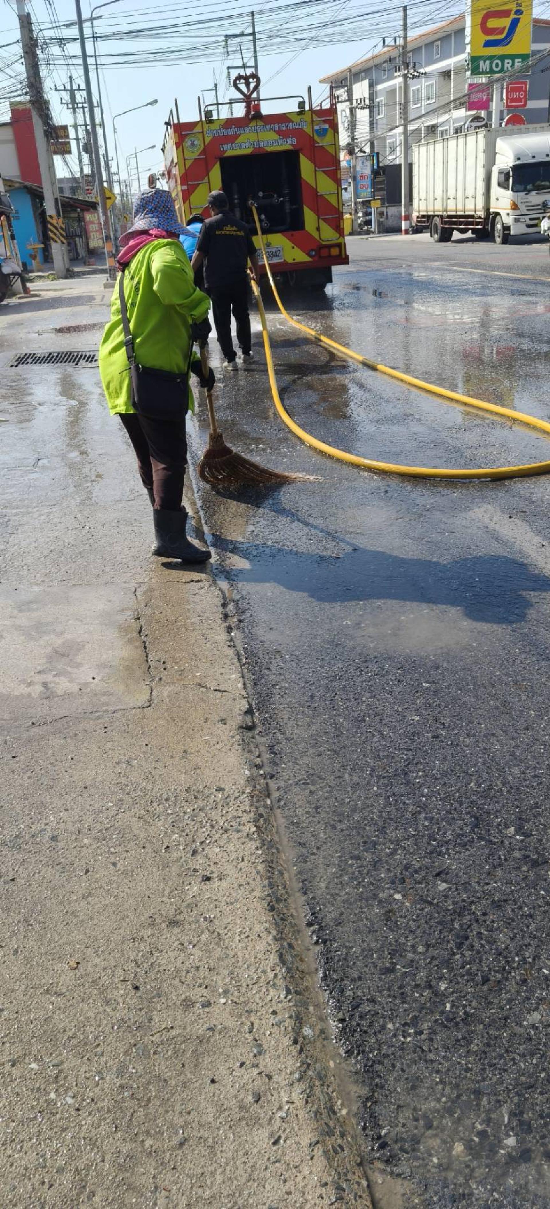 กองสาธารณสุขและสิ่งแวดล้อม ฝ่ายจัดการมูลฝอยและสิ่งปฏิกูล ดำเนินการล้างถนนบ้านเก่า- หนองตำลึง หมู่ที่ 7 เพื่อลดปริมาณฝุ่นละอองขนาดเล็ก (PM 2.5)