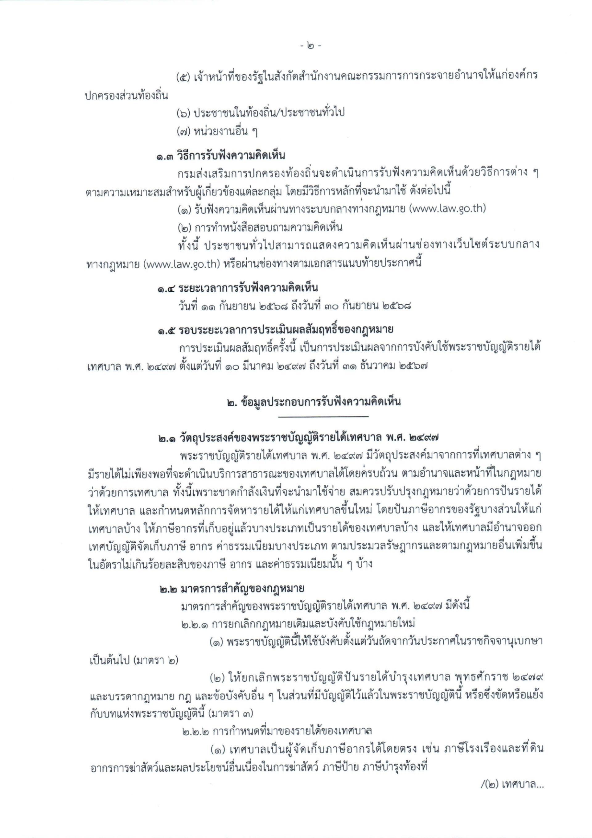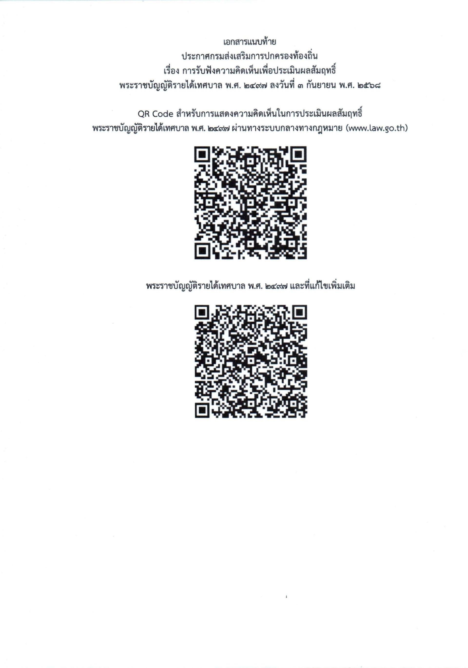 ประชาสัมพันธ์ ประกาศกรมส่งเสริมการปกครองท้องถิ่น เรื่อง การรับฟังความคิดเห็นเพื่อประเมินผลสัมฤทธิ์พระราชบัญญัติรายได้เทศบาล พ.ศ. 2497 รายละเอียดตามเอกสารที่แนบมาพร้อมนี้ https://law.go.th/listeningDetail?survey