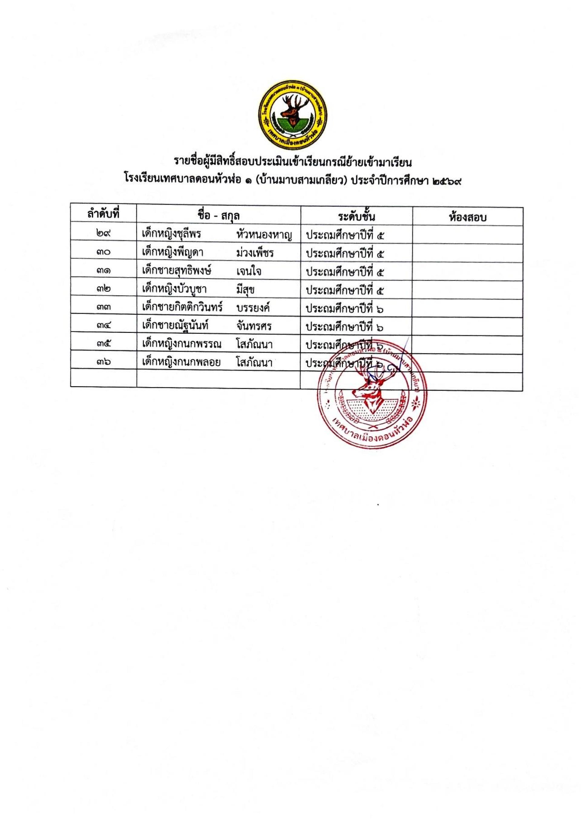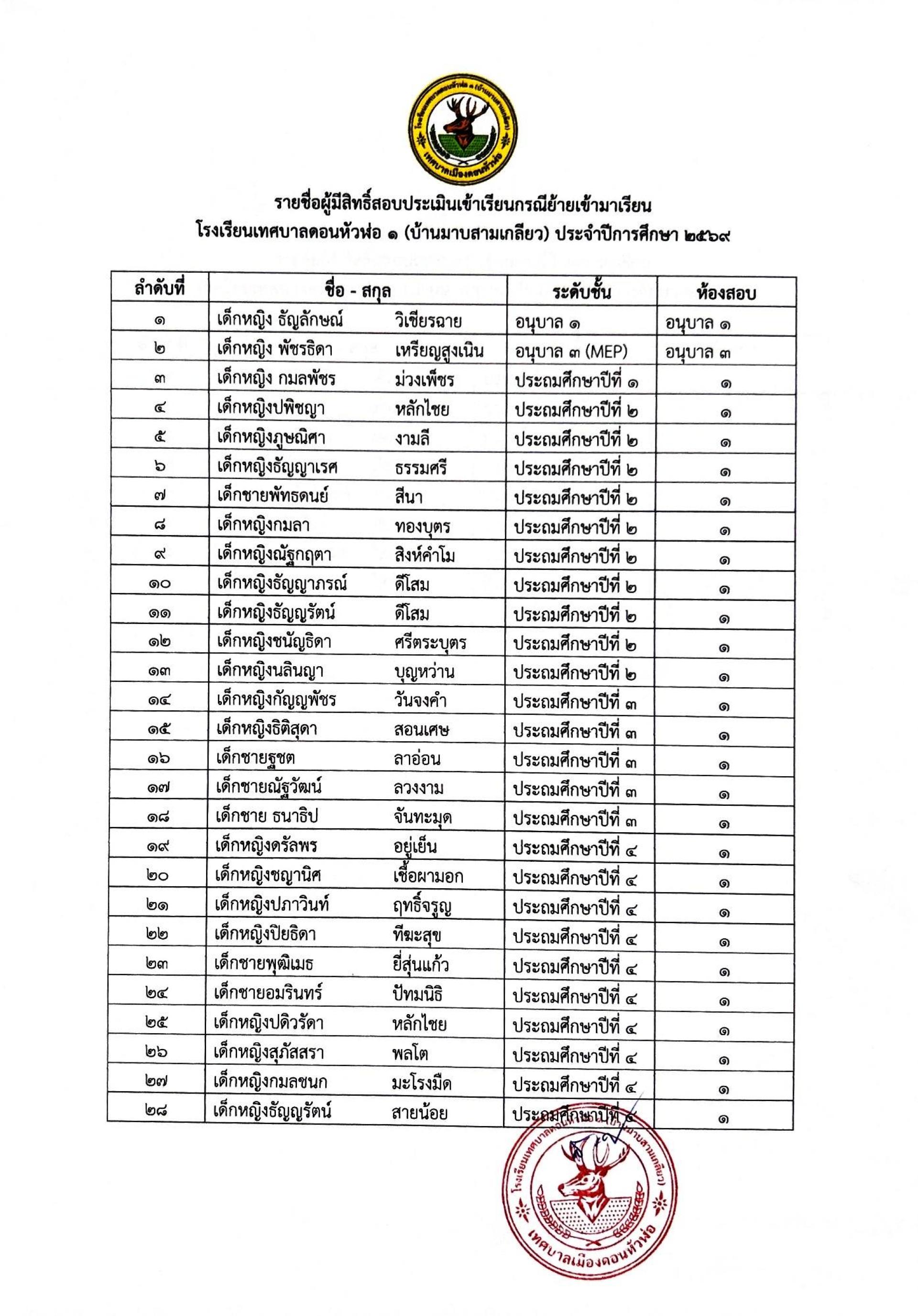 โรงเรียนเทศบาลดอนหัวพ่อ ๑ (บ้านมาบสามเกลียว) ประจำปีการศึกษา 2569