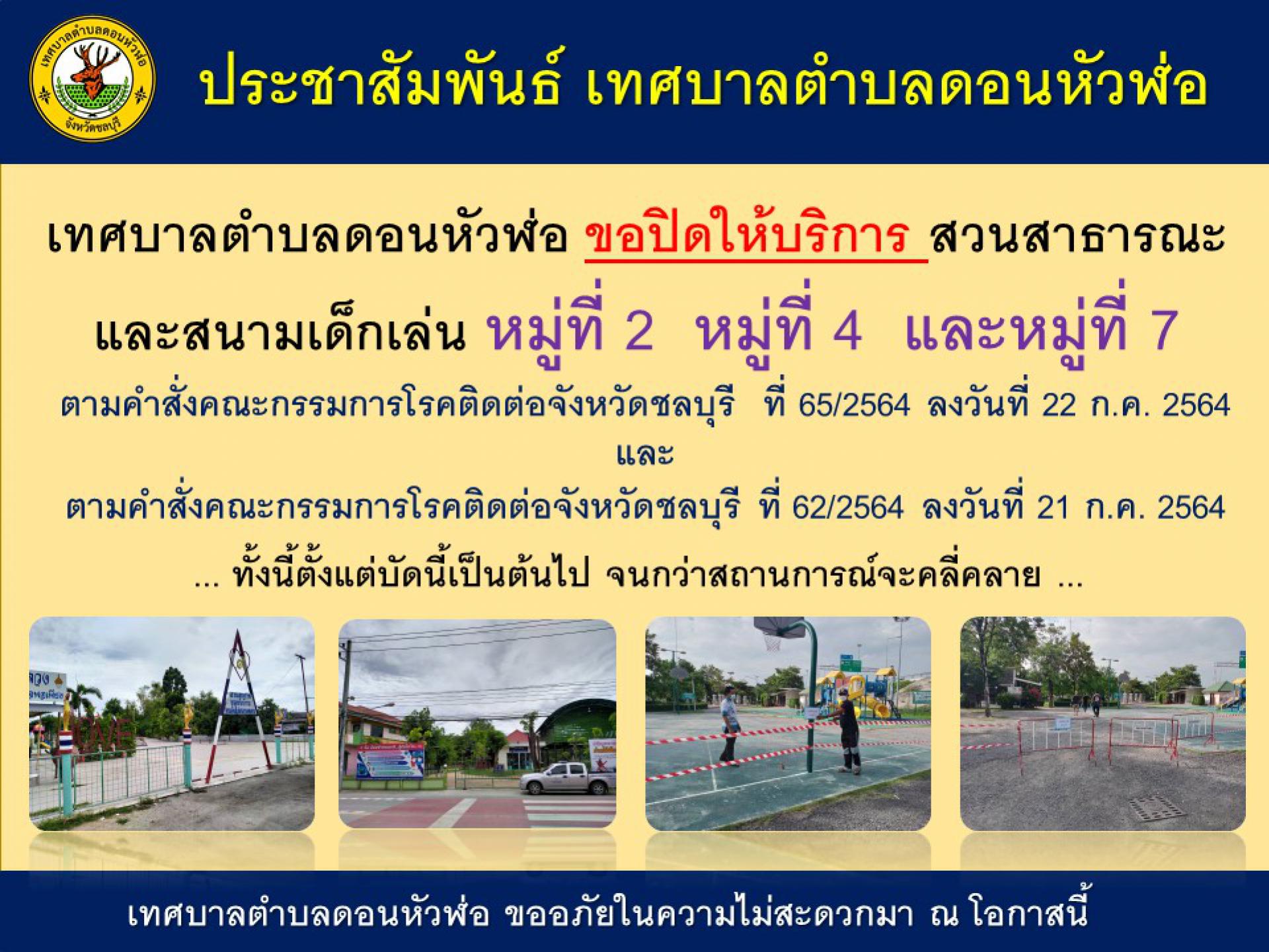 เทศบาลตำบลดอนหัวฬ่อ ขอปิดให้บริการ สวนสาธารณะ และสนามเด็กเล่น หมู่ที่ 2 หมู่ที่ 4 และหมู่ที่ 7 ตามคำสั่งคณะกรรมการโรคติดต่อจังหวัดชลบุรี