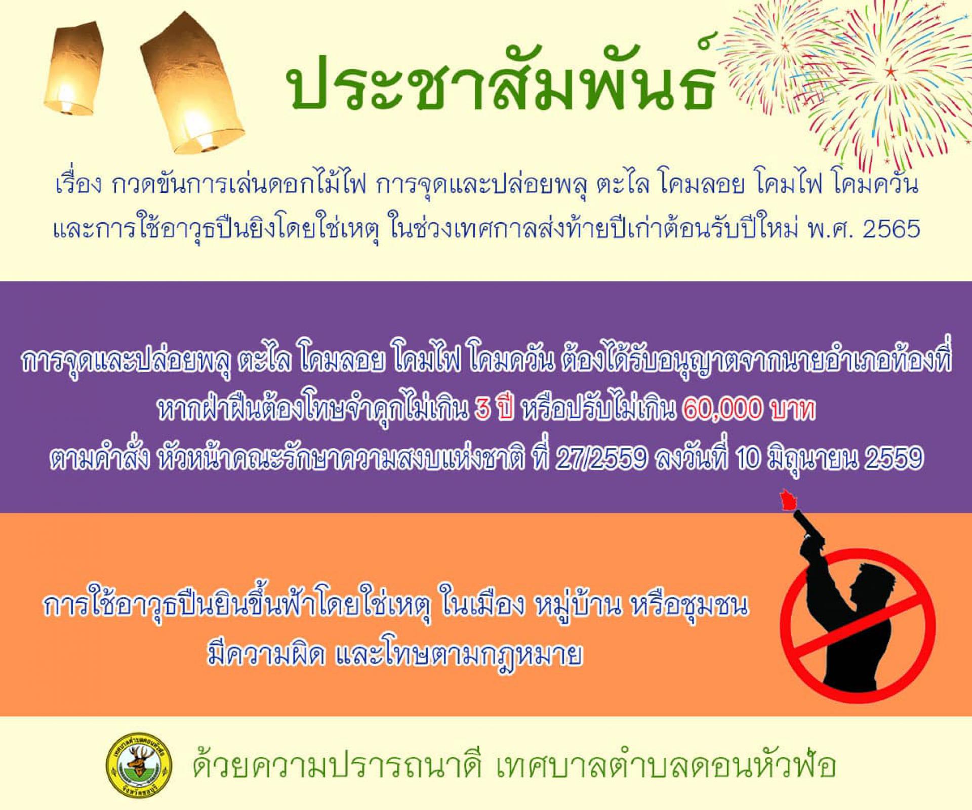 กวดขันการเล่นดอกไม้ไฟ การจุดและปล่อยพลุ ตะไล โคมลอย โคมไฟ โคมควัน และการใช้อาวุธปืนยินโดยใช่เหตุ ในช่วงเทศกาลส่งท้าย