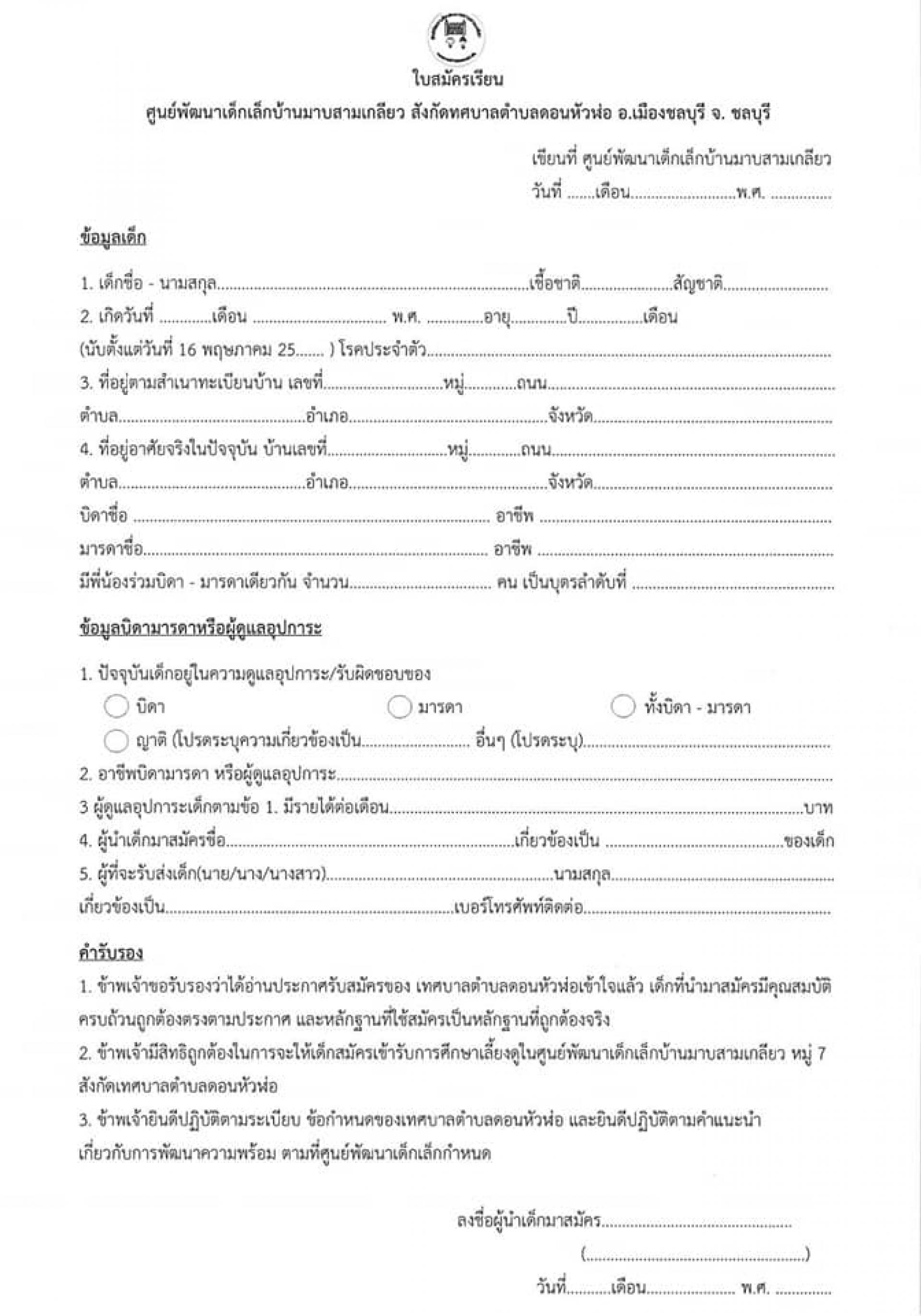 - ติดต่อขอรับใบสมัคร หรือสามารถดาวน์โหลดใบสมัคร โดยสแกน QR Code ที่ป้ายรับสมัคร หรือไฟล์ข้อมูลที่แนบมานี้ และสมัครได้ที่ศูนย์พัฒนาเด็กเล็กบ้านมาบสามเกลียว ในวันและเวลาราชการ ตั้งแต่วันที่ 1 มีนาคม - 22 เมษายน 2565