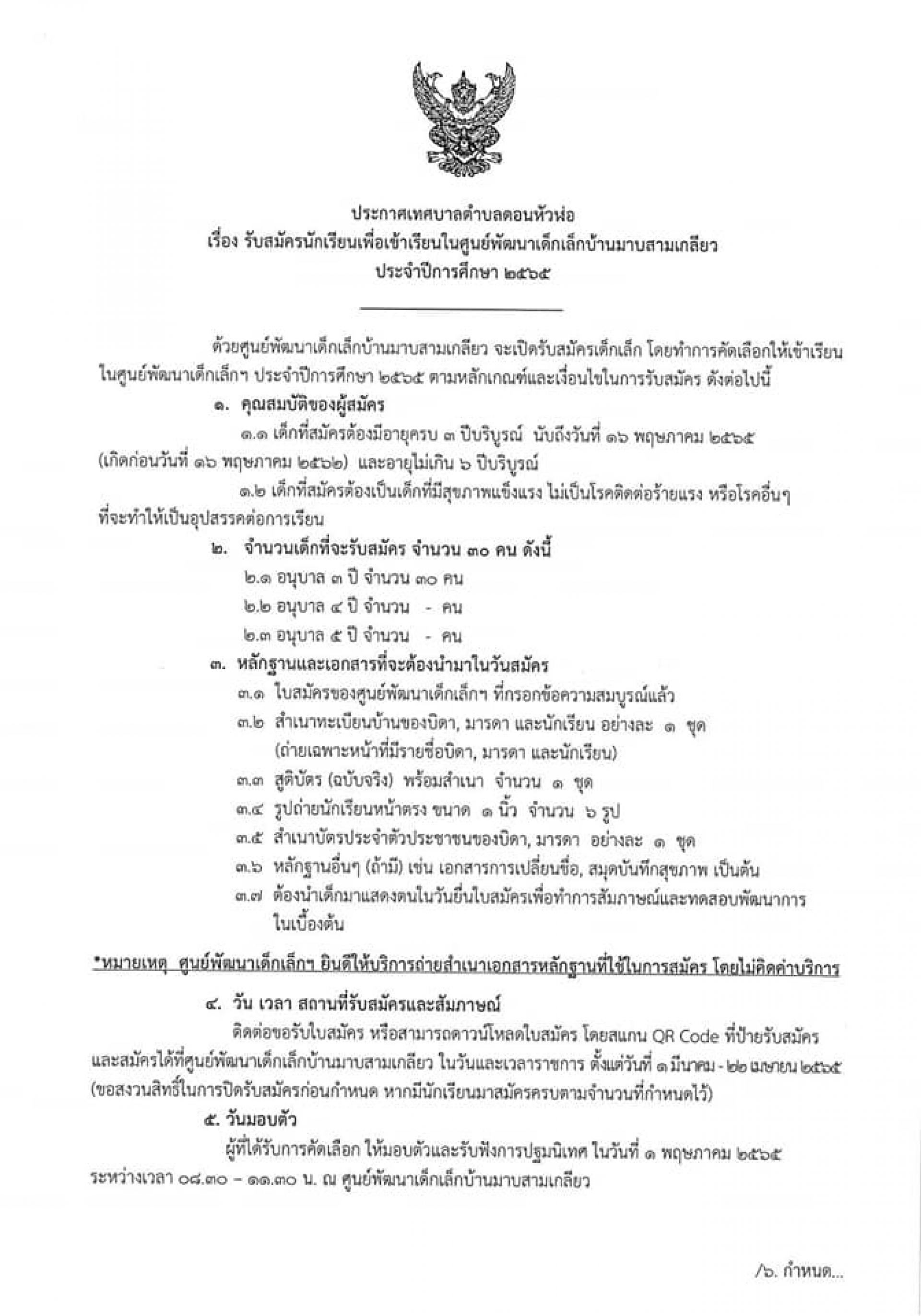 1. เด็กที่สมัครต้องมีอายุครบ 3 ปีบริบูรณ์ นับถึงวันที่ 16 พฤษภาคม 2565