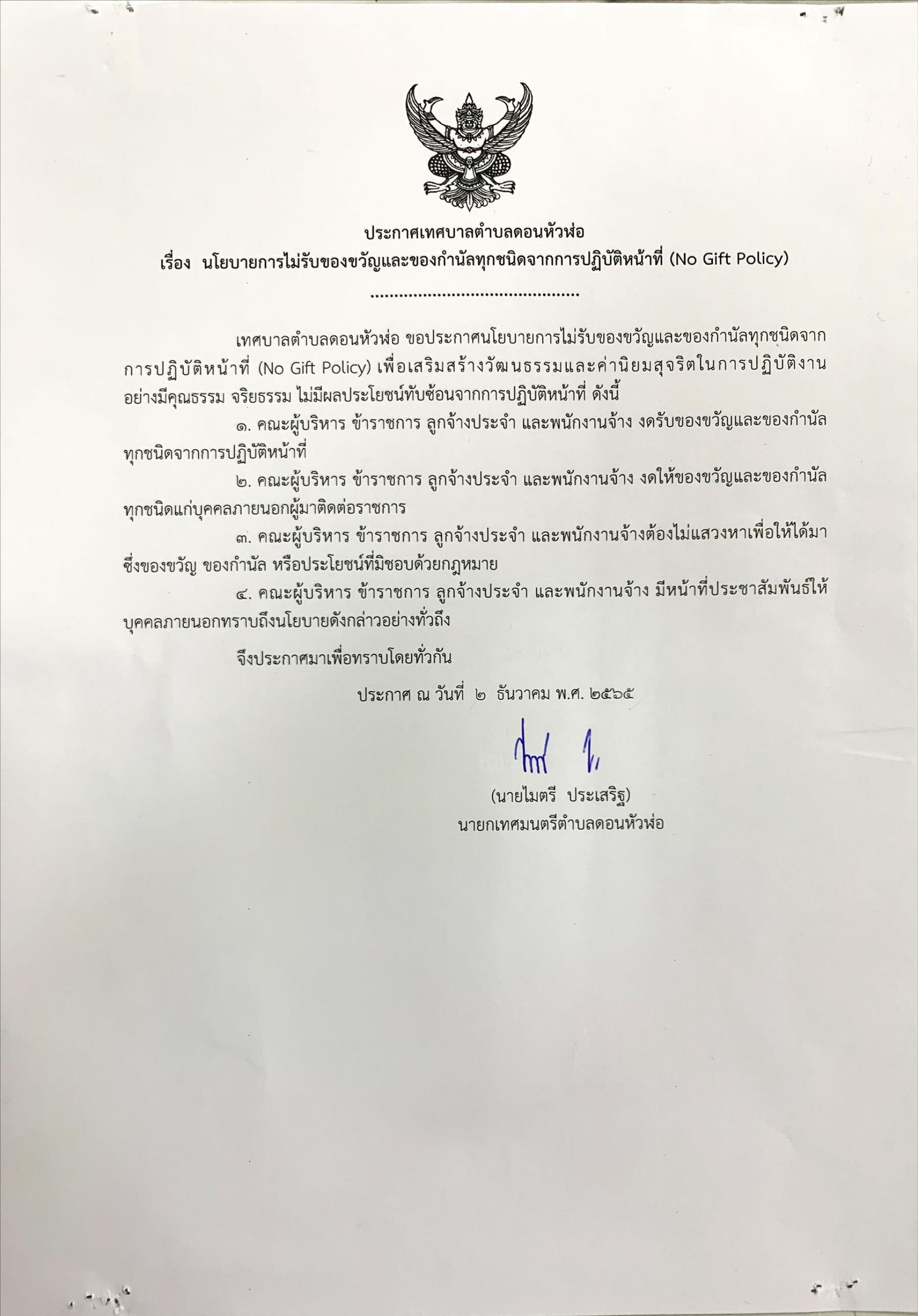 เทศบาลตำบลดอนหัวฬ่อ โดยนายไมตรี ประเสริฐ นายกเทศมนตรีตำบลดอนหัวฬ่อ ได้ประกาศนโยบายการไม่รับของขวัญ และของกำนัลทุกชนิดจากการปฏิบัติหน้าที่ (No Gift Policy) เพื่อให้คณะผู้บริหาร ข้าราชการ ลูกจ้างประจำ และพนักงานจ้าง ทราบและถือปฏิบัติ เมื่อวันที่ 2 ธันวาคม 2565