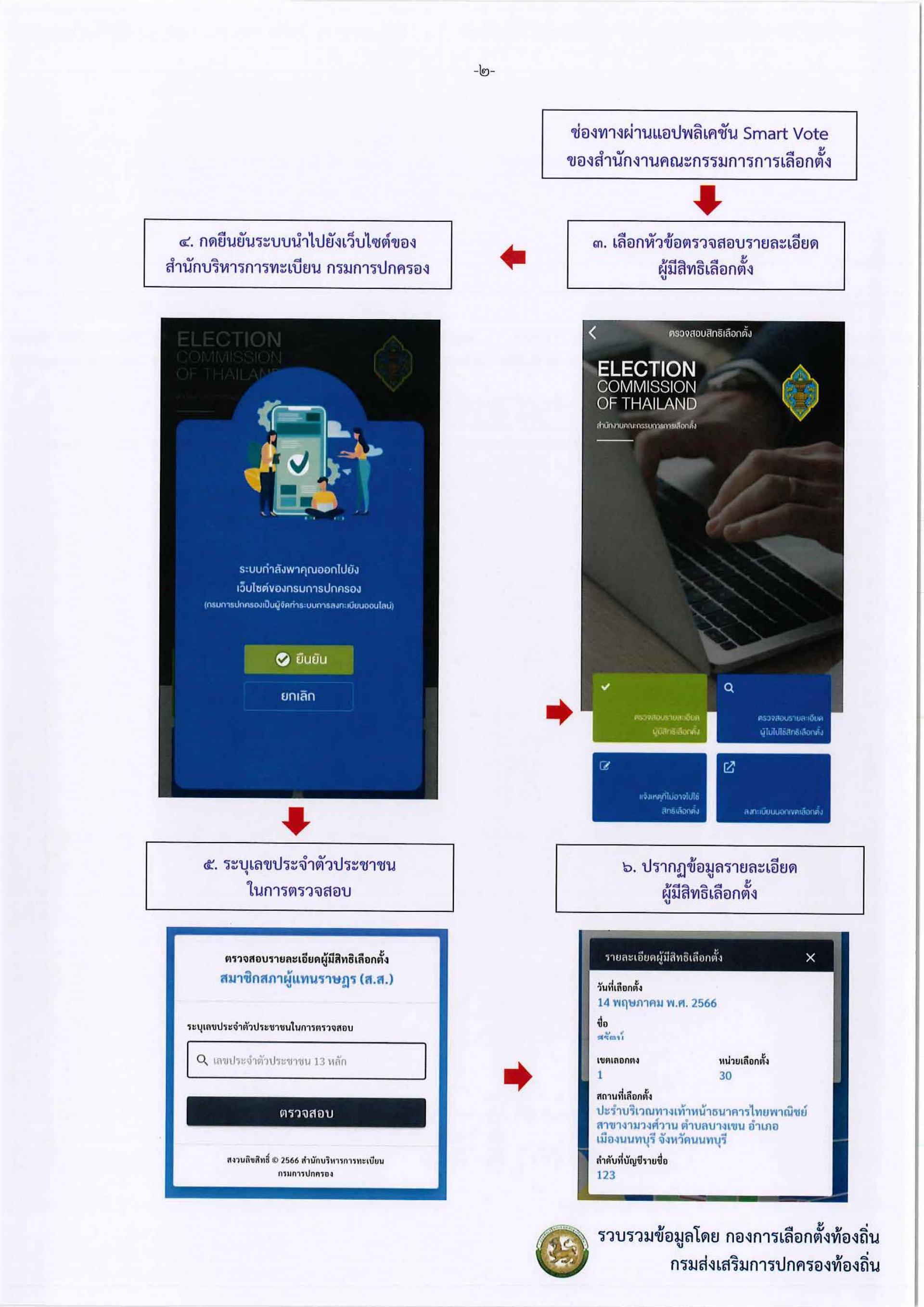 2) ตรวจสอบรายชื่อผู้มีสิทธิเลือกตั้งได้ที่เว็บไซต์ของสำนักบริหารการทะเบียน www.bora.dopa.go.th หรือผ่านแอปพลิเคชั่น Smart Vote ของสำนักงานคณะกรรมการการเลือกตั้งได้ตลอด 24 ชั่วโมง