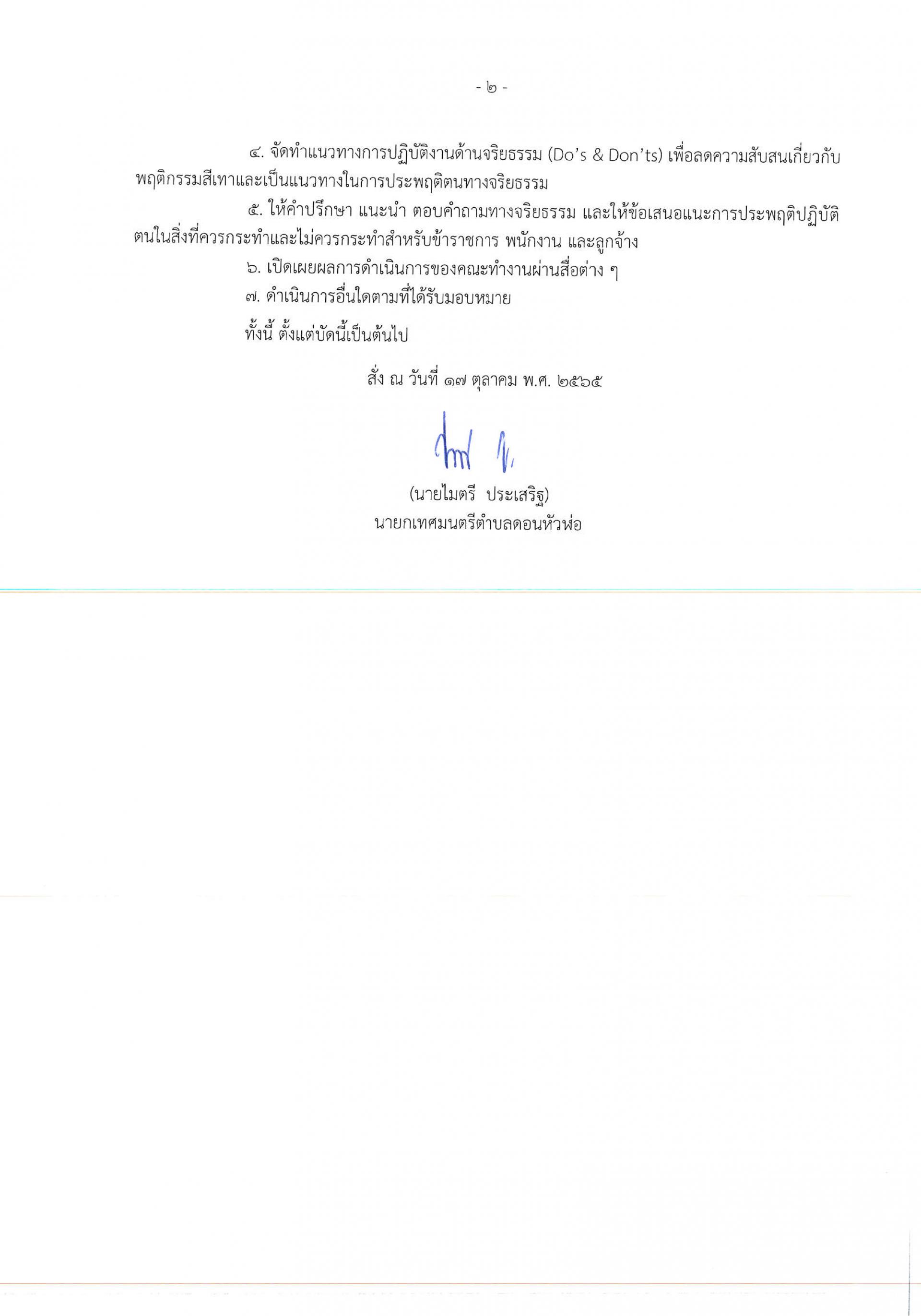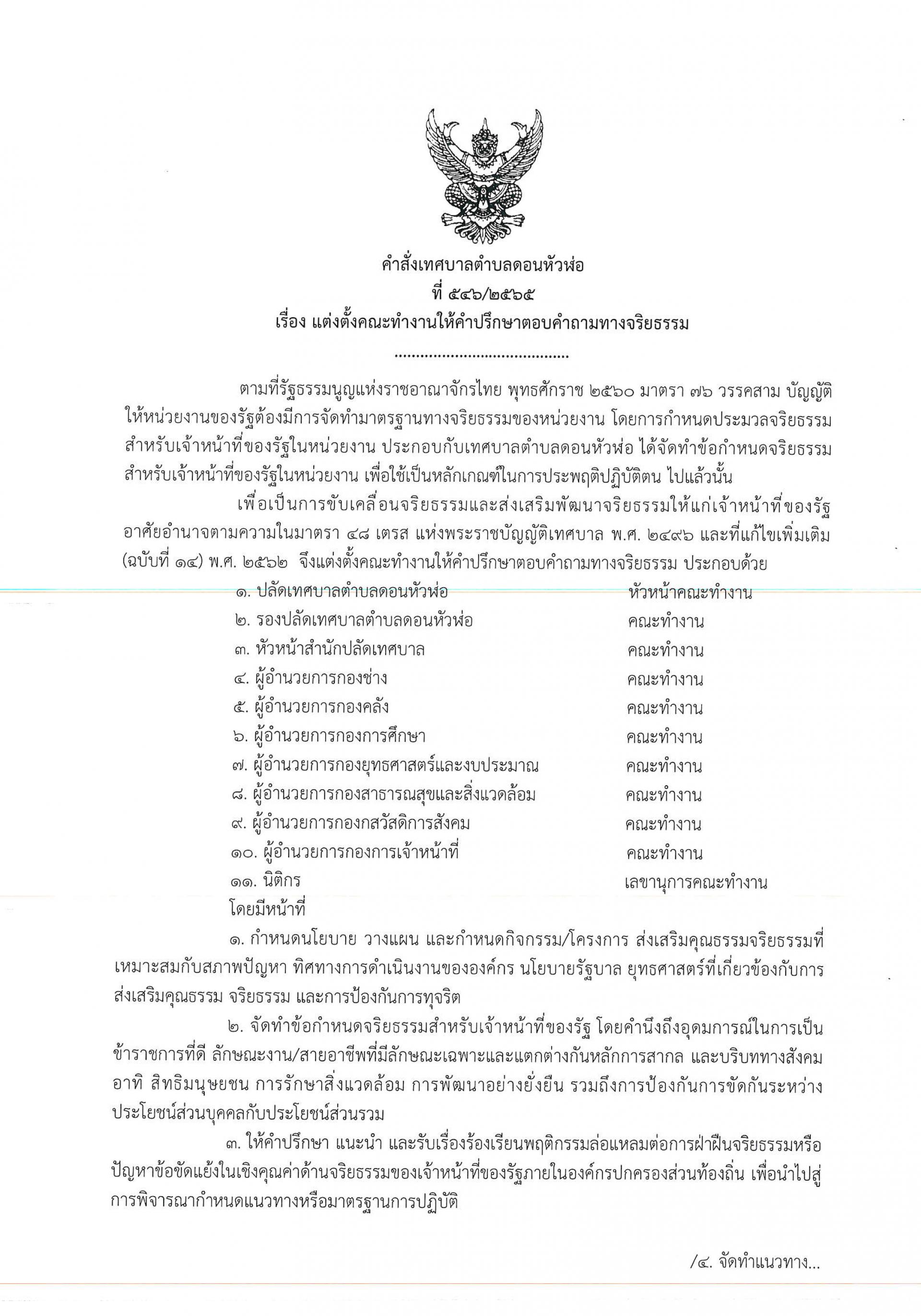 คำสั่งเทศบาลตำบลดอนหัวฬ่อ ที่ ๕๔๖/๒๕๖๕ เรื่อง แต่งตั้งคณะทำงานให้คำปรึกษาตอบคำถามทางจริยธรรม เทศบาลตำบลดอนหัวฬ่อ