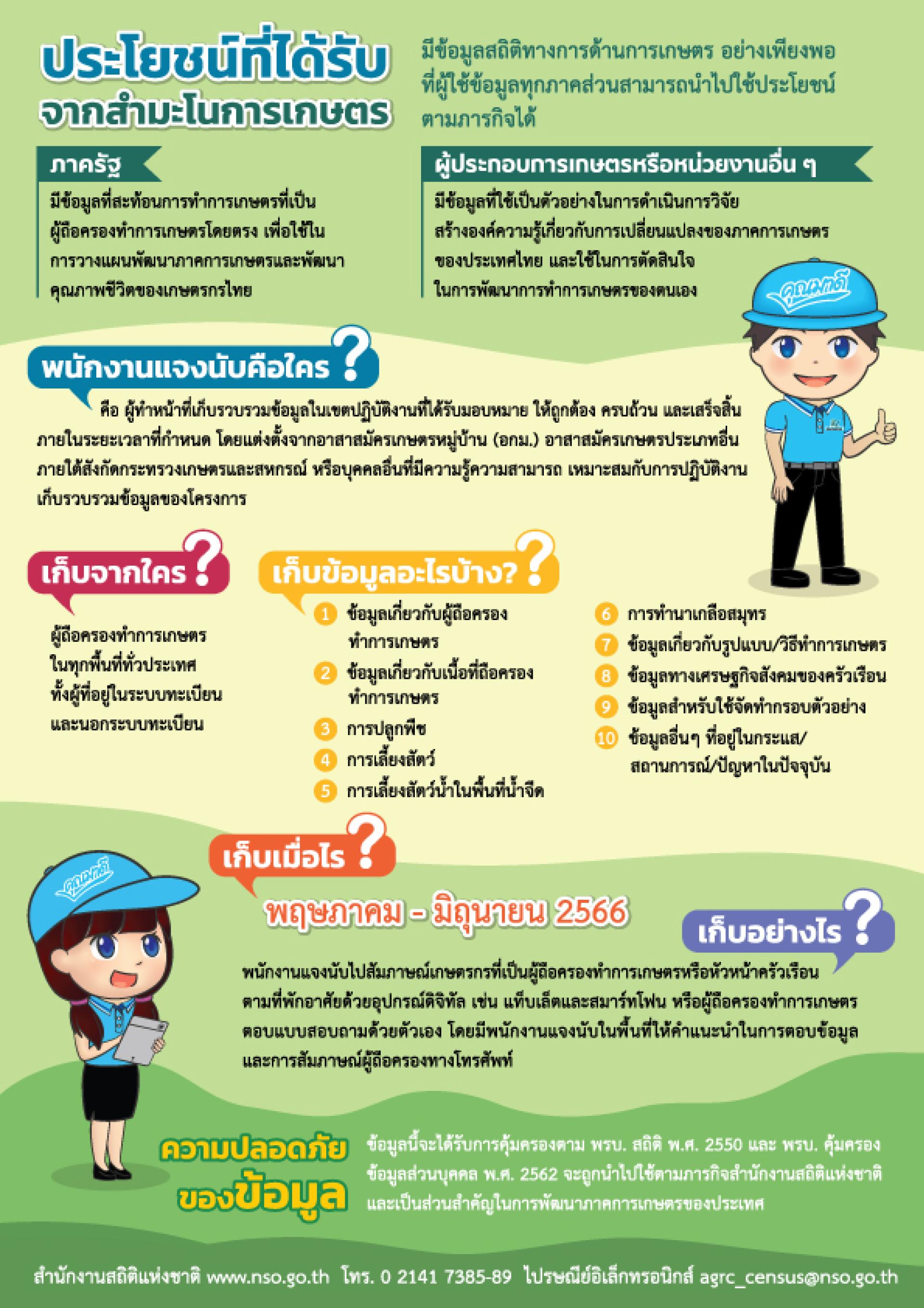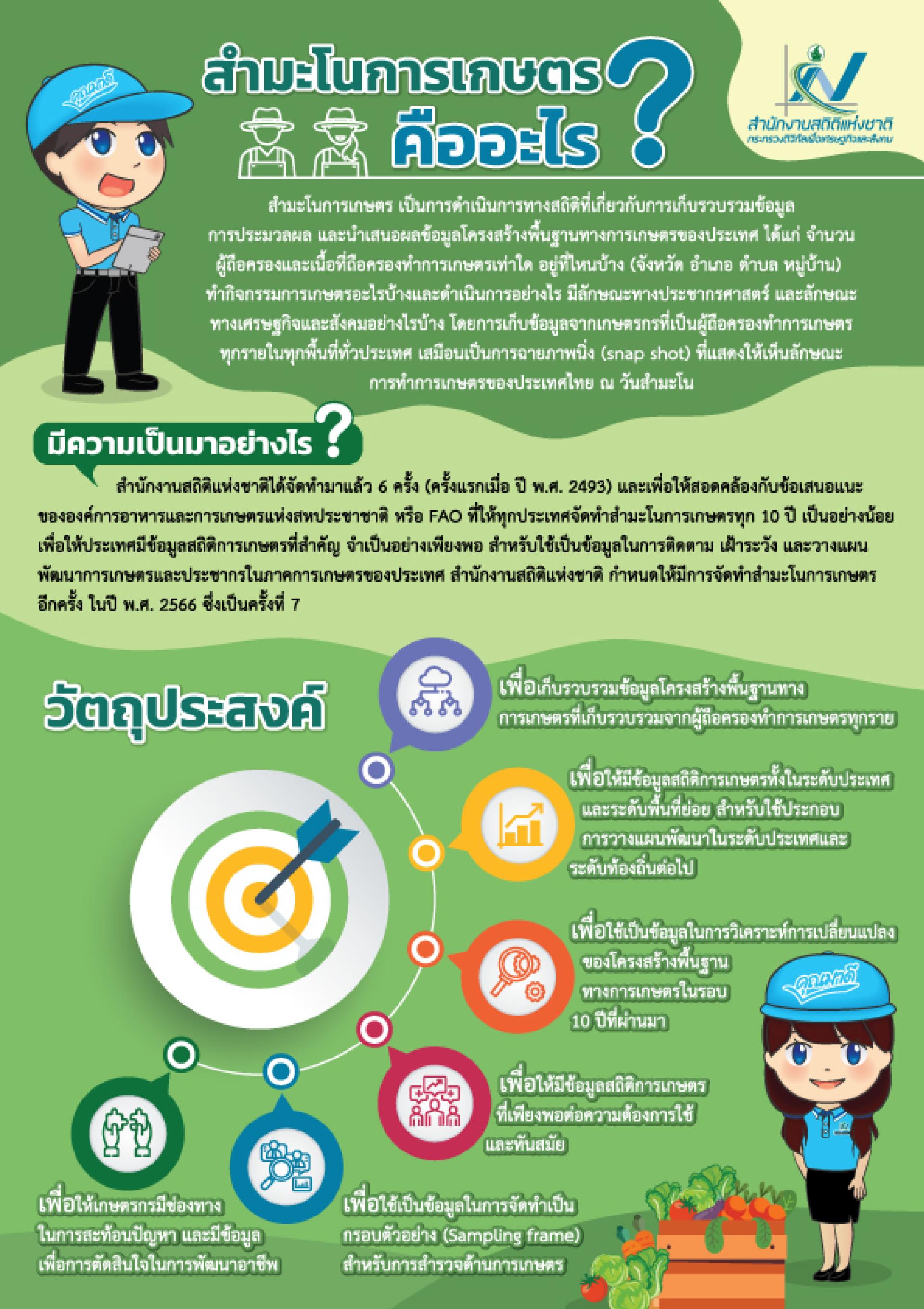 สำนักงานสถิติแห่งชาติ ได้จัดทำโครงการสำมะโนการเกษตร พ.ศ. 2566 โดยจัดทำขึ้นเป็นครั้งที่ 7 มีวัตถุประสงค์เพื่อเก็บรวบรวมข้อมูลเกี่ยวกับจำนวนและเนื้อที่ถือครองทำการเกษตร รวมถึงลักษณะของการทำการเกษตรจากเกษตรกรที่เป็นผู้ถือครองทำการเกษตรทุกราย ในทุกพื้นที่ทั่วประเทศ ให้ประเทศมีข้อมูลโครงสร้างพื้นฐานทางการเกษตรที่สำคัญและจำเป็นอย่างเพียงพอต่อการใช้ประโยชน์ในประเทศ และสามารถเปรียบเทียบกับประเทศอื่น ๆ ได้