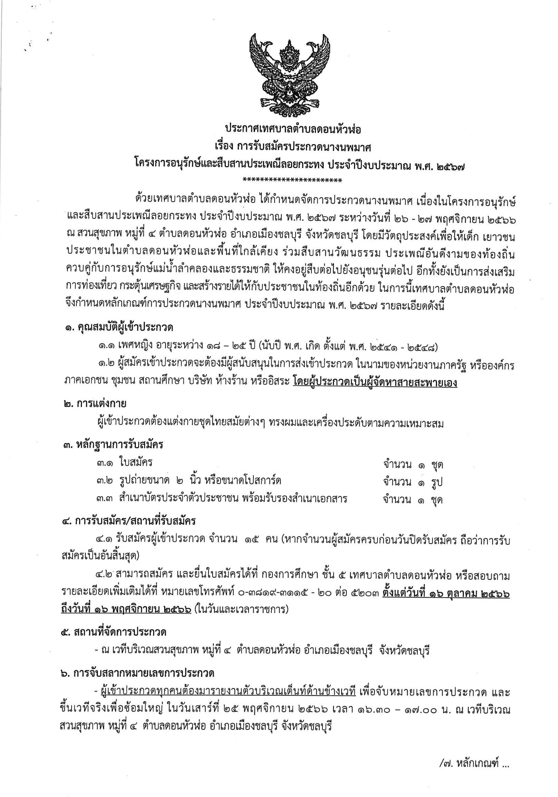 เทศบาลตำบลดอนหัวฬ่อ ขยายเวลาเปิดรับสมัครผู้เข้าประกวดนางนพมาศ อายุุระหว่าง 16-25 ปี โครงการอนุรักษ์และสืบสานประเพณีลอยกระทง ประจำปีงบประมาณ 2567