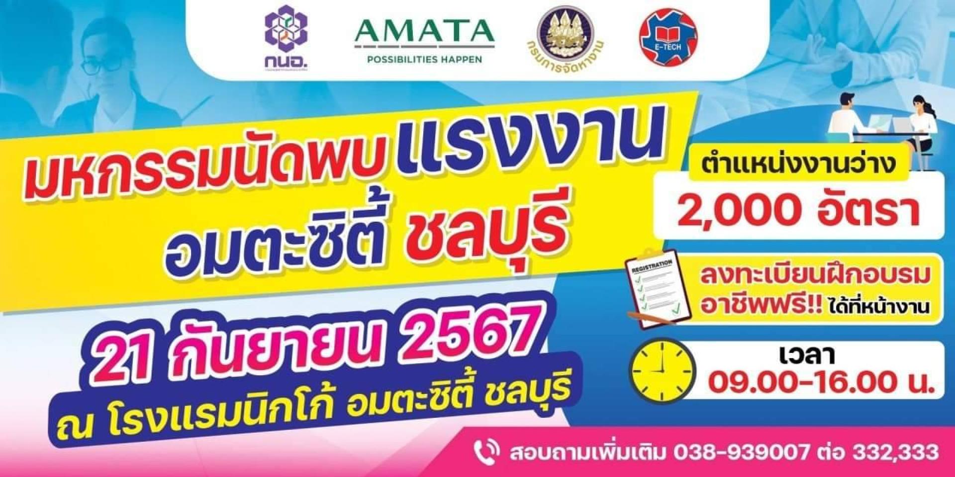 อมตะ เชิญร่วมงาน "มหกรรมนัดพบแรงงานอมตะซิตี้ชลบุรี" ประจำปี 2567 ในวันเสาร์ที่ 21 กันยายน 2567 เวลา 09.00-16.00 น. ณ โรงแรมนิกโก้ อมตะซิตี้ ชลบุรีบริษัท อมตะ คอร์ปอเรชัน จำกัด (มหาชน) ร่วมกับสำนักงานนิคมอุตสาหกรรมอมตะซิตี้ ชลบุรี สำนักงานจัดหางานชลบุรี และวิทยาลัยเทคโนโลยีภาคตะวันออก (อี.เทค.) จัดงาน "มหกรรมนัดพบแรงงานอมตะซิตี้ชลบุรี" ประจำปี 2567 โดยคาดว่าจะมีตำแหน่งงานมากกว่า 2,000 ตำแหน่ง และมีฝึกอบรมอาชีพฟรี ผู้ที่สนใจสามารถลงทะเบียนได้ที่หน้างาน ติดต่อสอบถามเพิ่มเติมได้ที่ 038 939007 ต่อ 332, 333